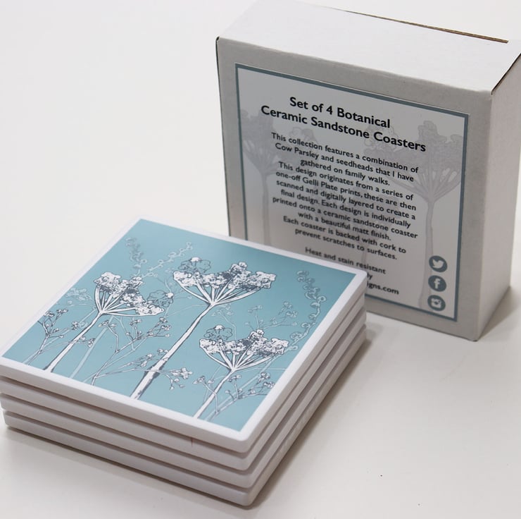 This design features a combination of Cow Parsley and Seedheads that I have gathered on family walks. This design originated from a series of one-off Gelli plate prints, I then scanned and layered my prints using digital techniques to create the placemat design. Each coaster is individually printed in my home studio.