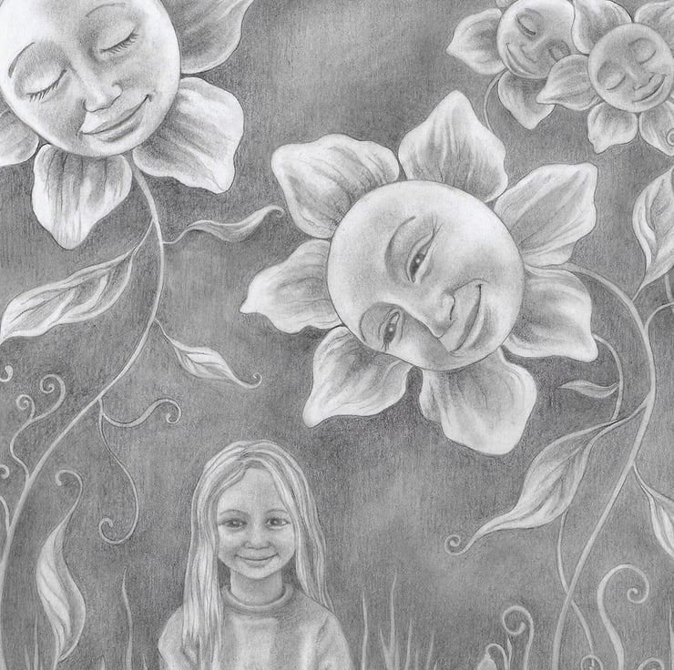In order to create this joyful piece, I used a photograph of my son in front of a tall old wall at Hampton Court Palace as inspiration - he sat amongst these gorgeous dahlia flowers.I also used myself and my niece as inspiration!