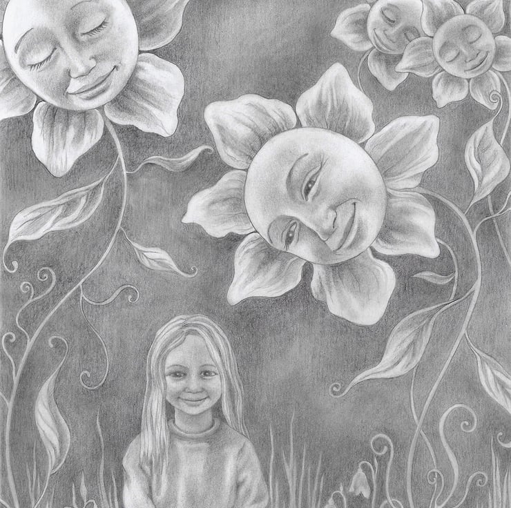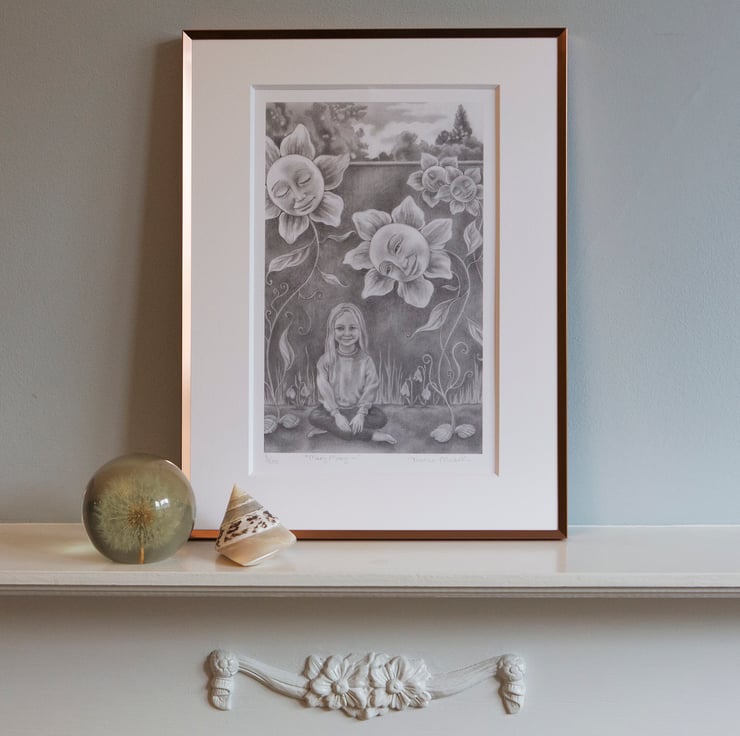 My pencil drawing was inspired by both the Nursery Rhyme "Mary, Mary, quite contrary, How does your garden grow?..." and a photo of my son sitting amongst the dahlias in front of a tall old wall at Hampton Court Palace. The original piece sold, but I have beautiful prints of it: