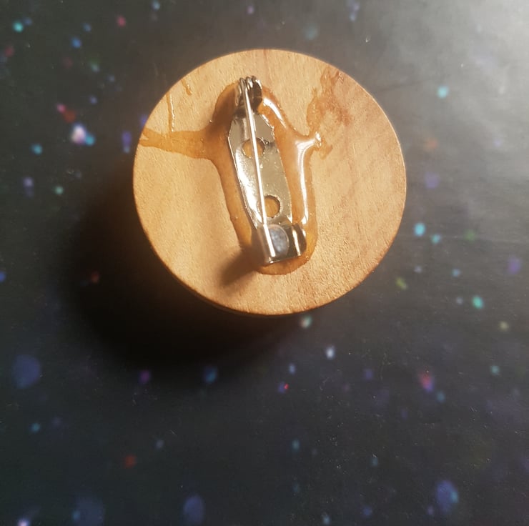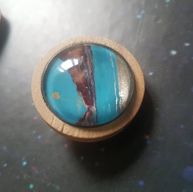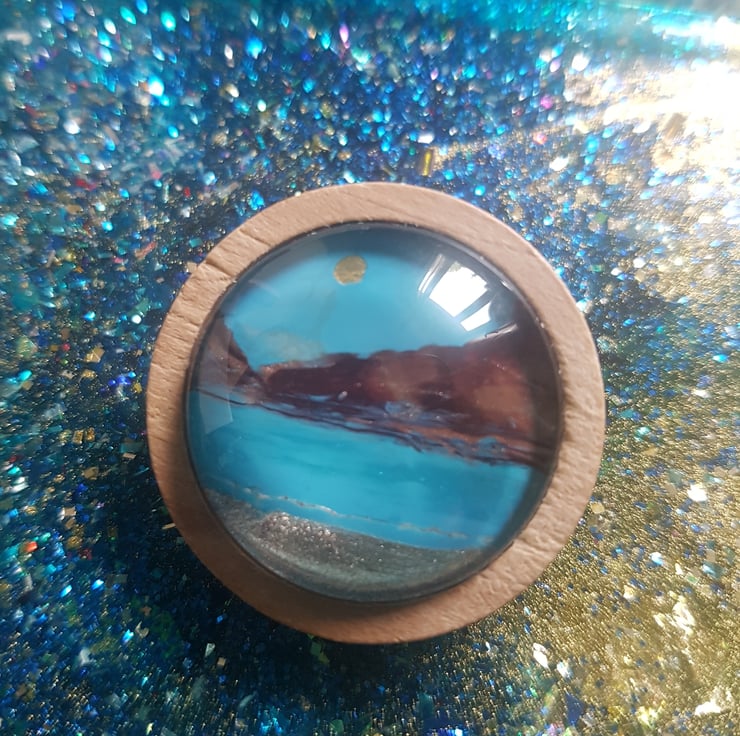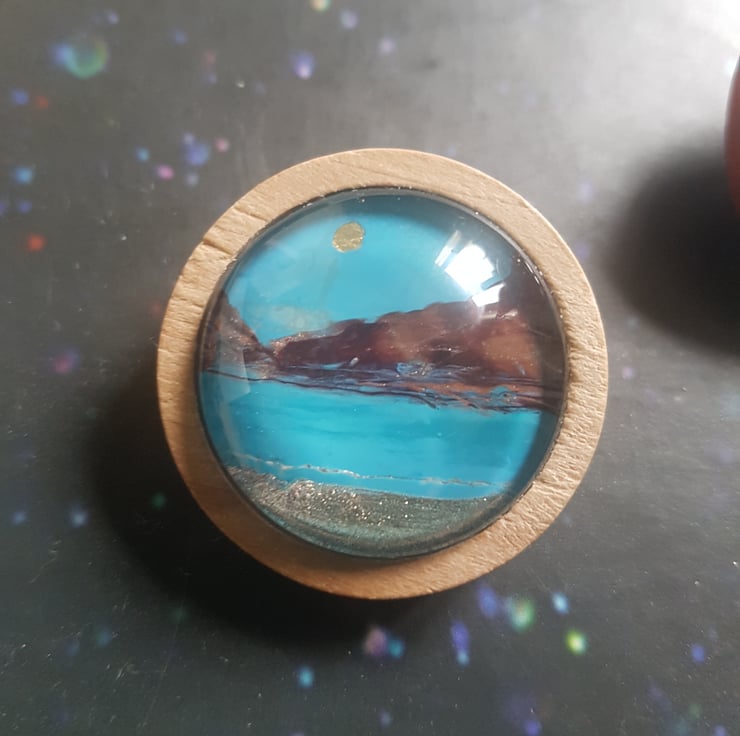 Circular wooden handmade brooch handpainted with a sea and landscape original design and unique.