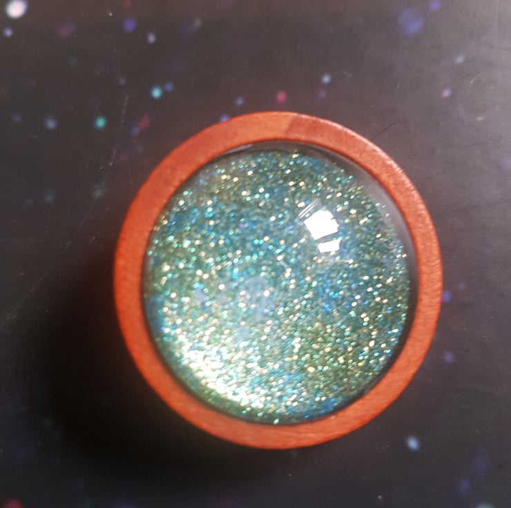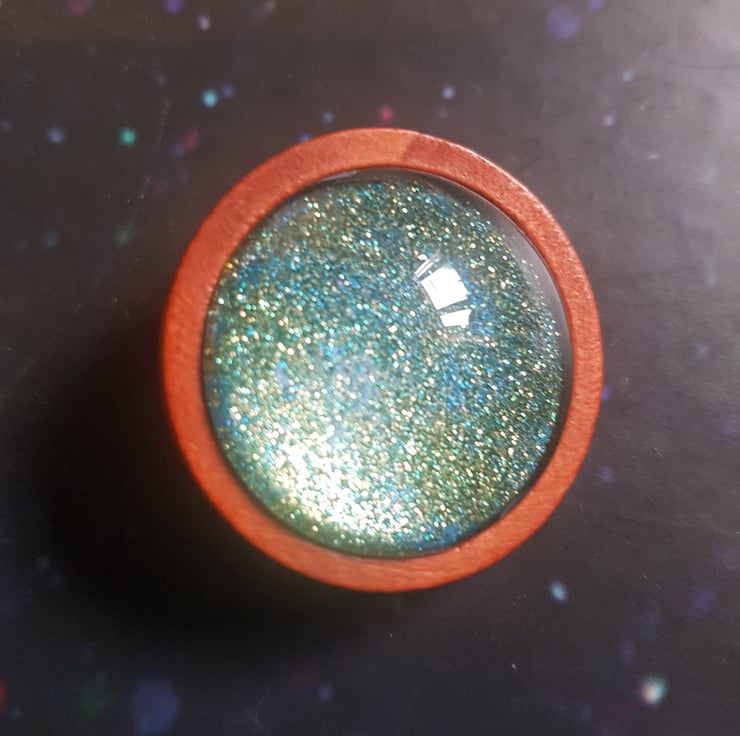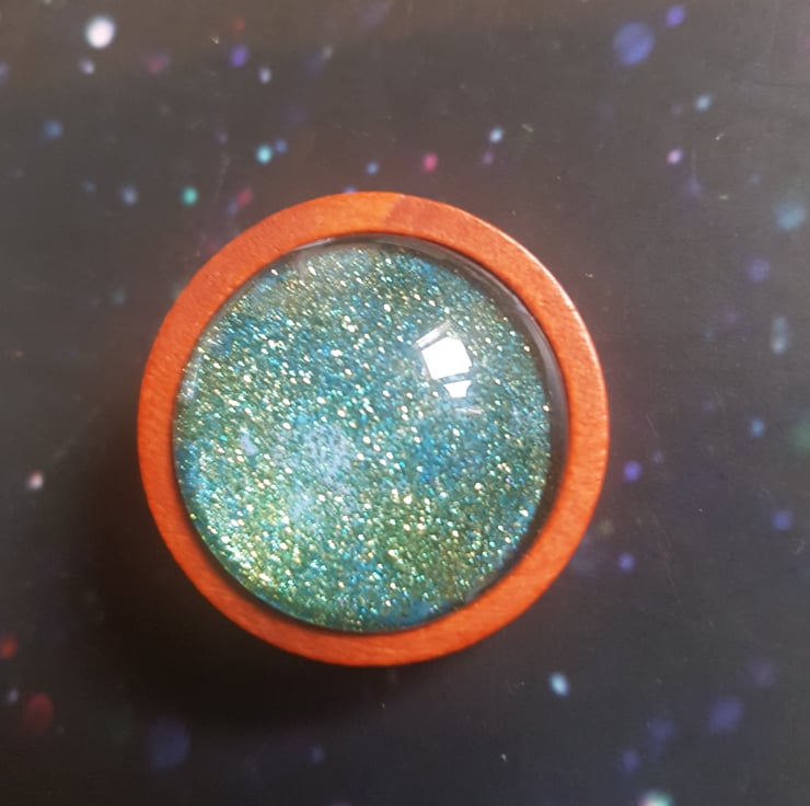 Circular wooden handmade brooch handcrafted with a sparkling holographic design