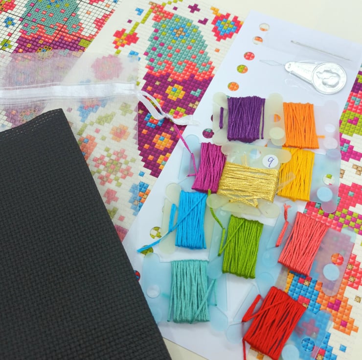 The kit contains everything you need except scissors I've added a few extras like a needle threader and thread organiser card. Its packaged in a sugar almond pink gift box, perfect for popping in the post.