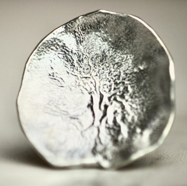 Reticulated eco silver disc ring with adjustable band. This textured silver effect is created by taking the silver to melting point then removing the heat completely, creating this molten texture which is called reticulation.