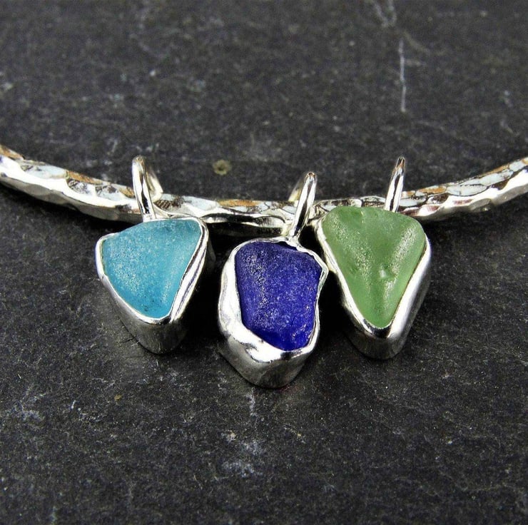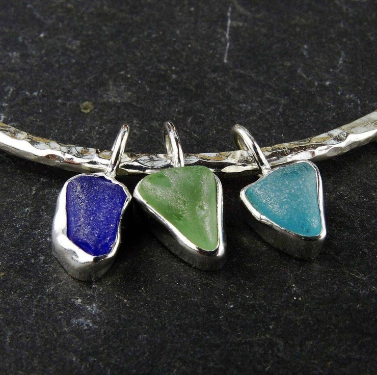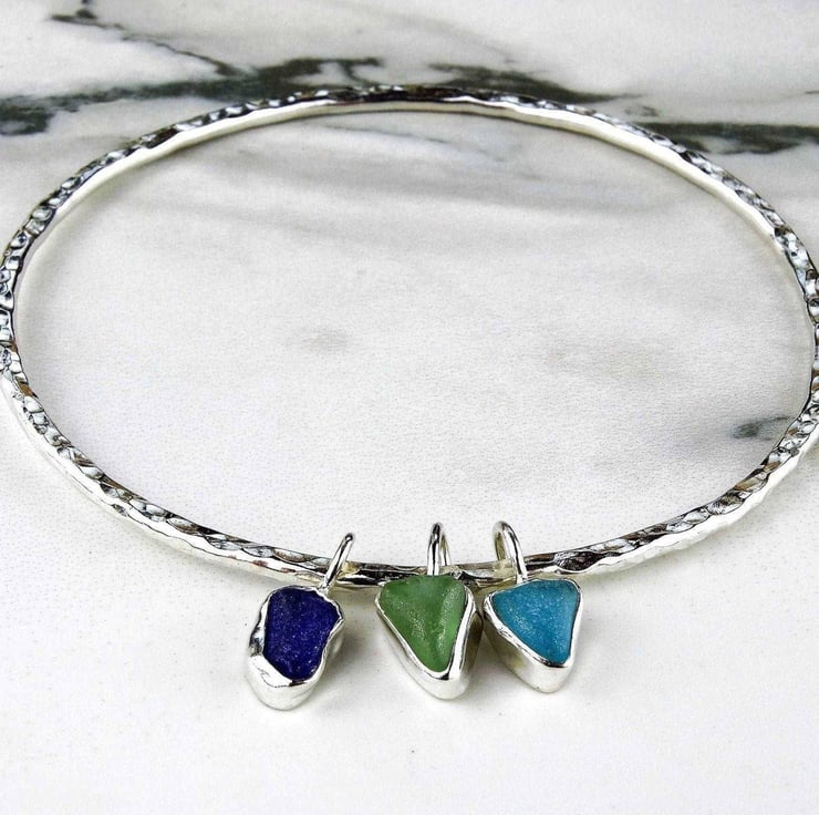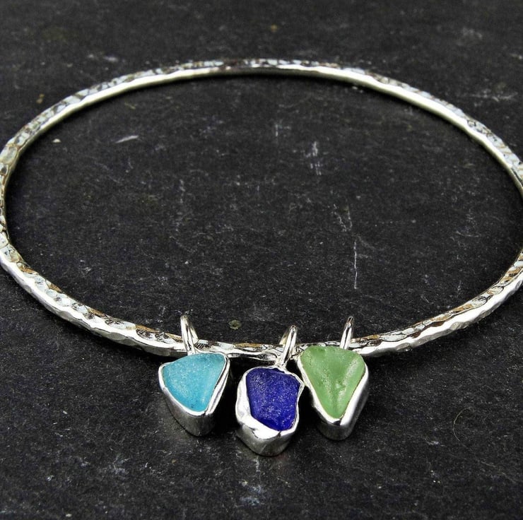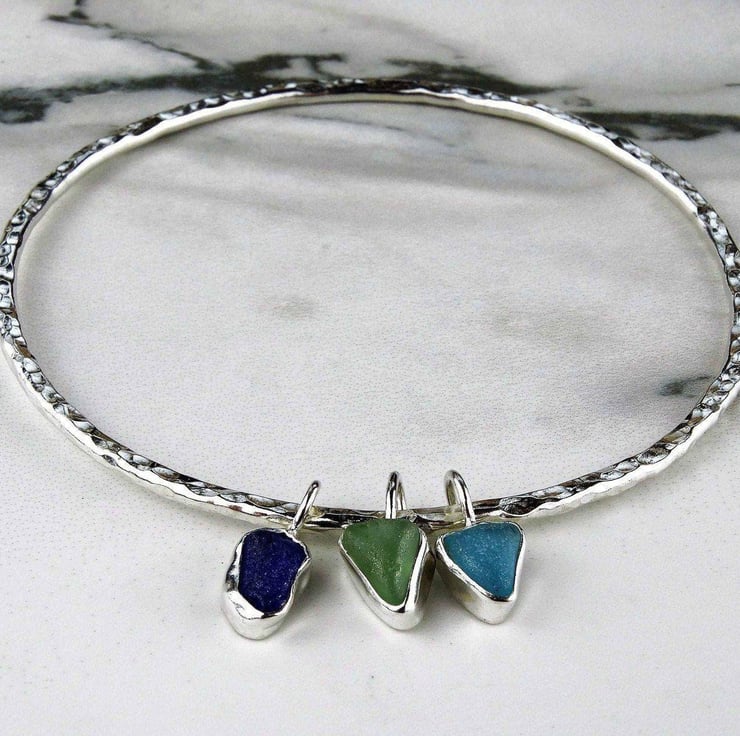 Blue & green sea glass charm bangle - Sterling silver, hammered bangle, featuring three bluegreen sea glass charms. Each piece of sea glass is harvested from the South Devon coast by myself and my family. This particular bangle features unusual blue tones, each one a different shade.