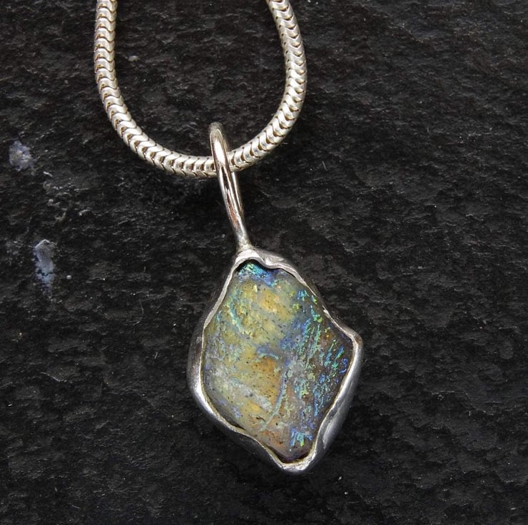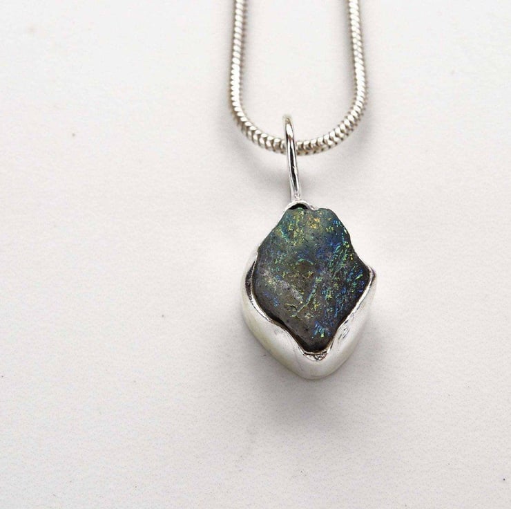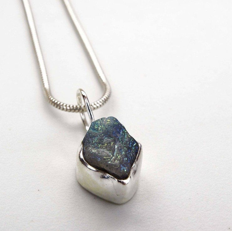 Beautiful raw labradorite pendant. This labradorite has a lovely textured appearance with flashes of blues and yellows. This is a lovely unusual pendant and a complete one off.