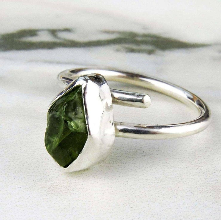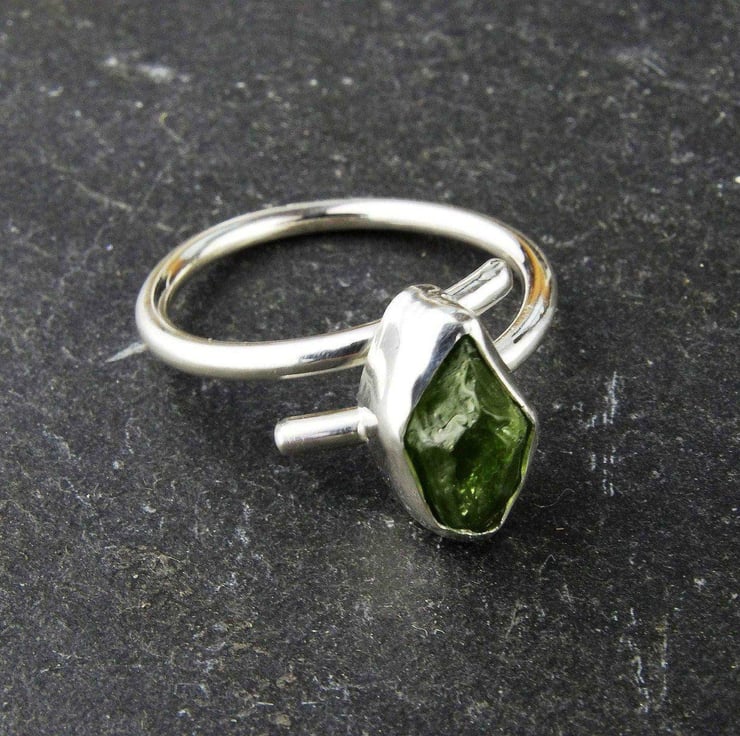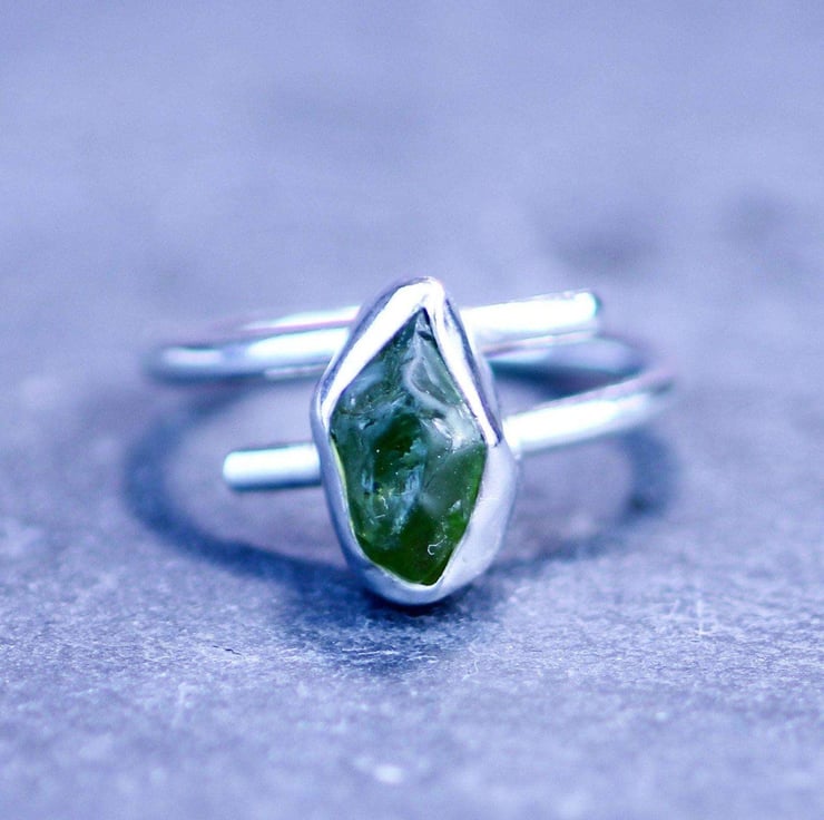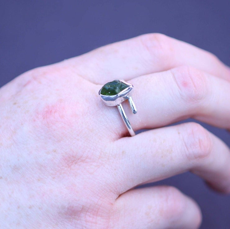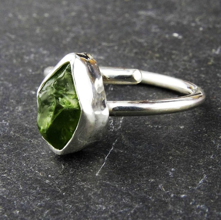 Raw peridot ring - August birthstone - Raw peridot, set in sterling silver on an adjustable band.