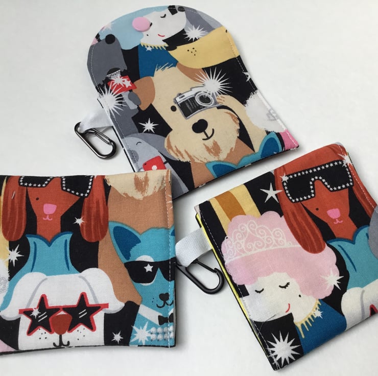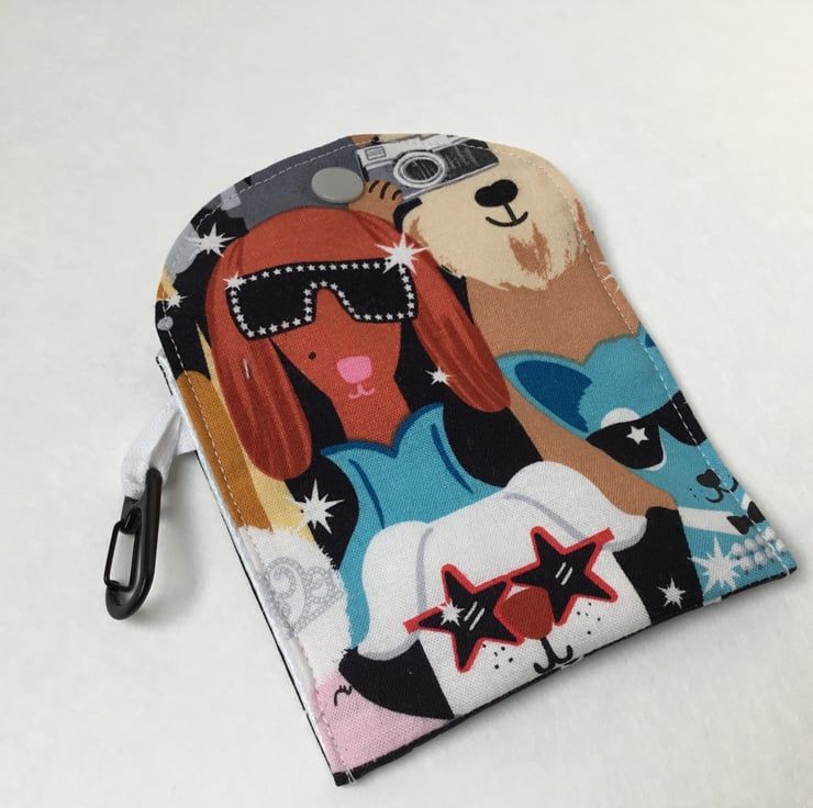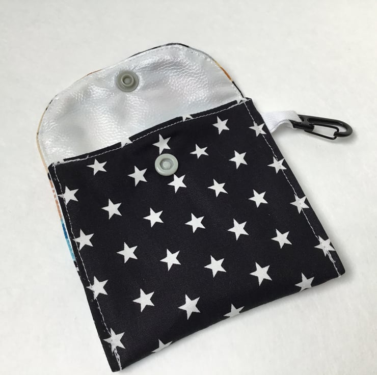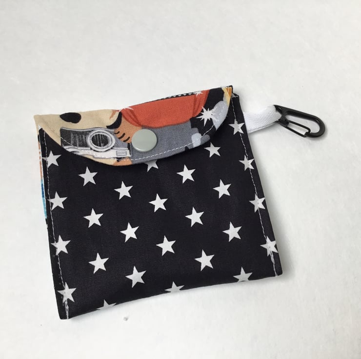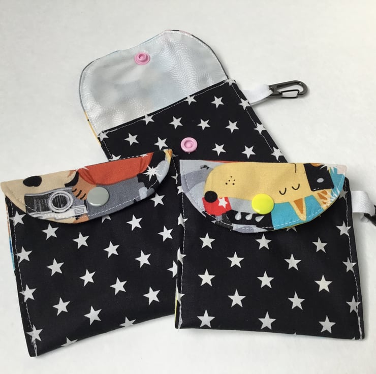 This listing is for a small washable and reusable pouch to keep your dogs treats handy and fresh. The pouch measures approximately 10cm square and fastens with a snap fastener. The outer is 100% cotton featuring stars and starry-eyed dogs. The inner is made from PUL - a soft, breathable and waterproof, food-safe fabric.