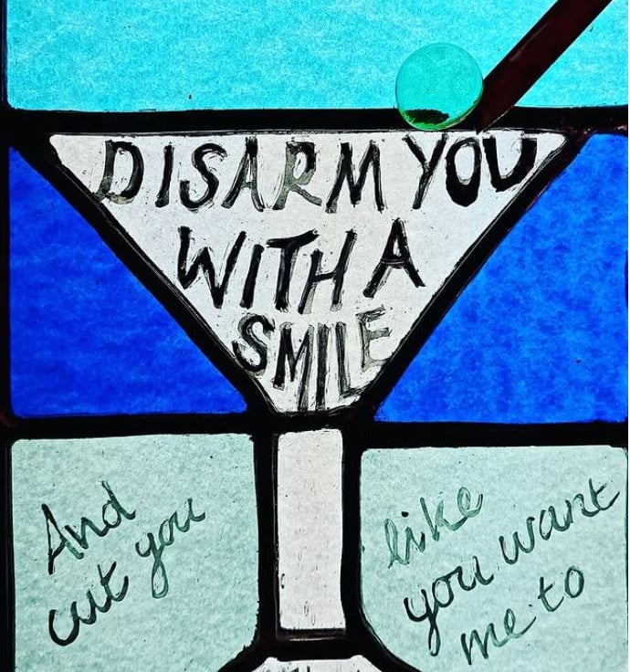 This is one of the panels from 'Amy's Late Night Bar of Bad Decisions' - a little shot of lyrics in a cocktail glass