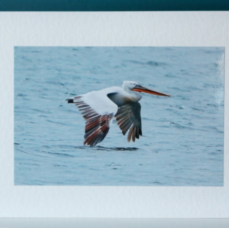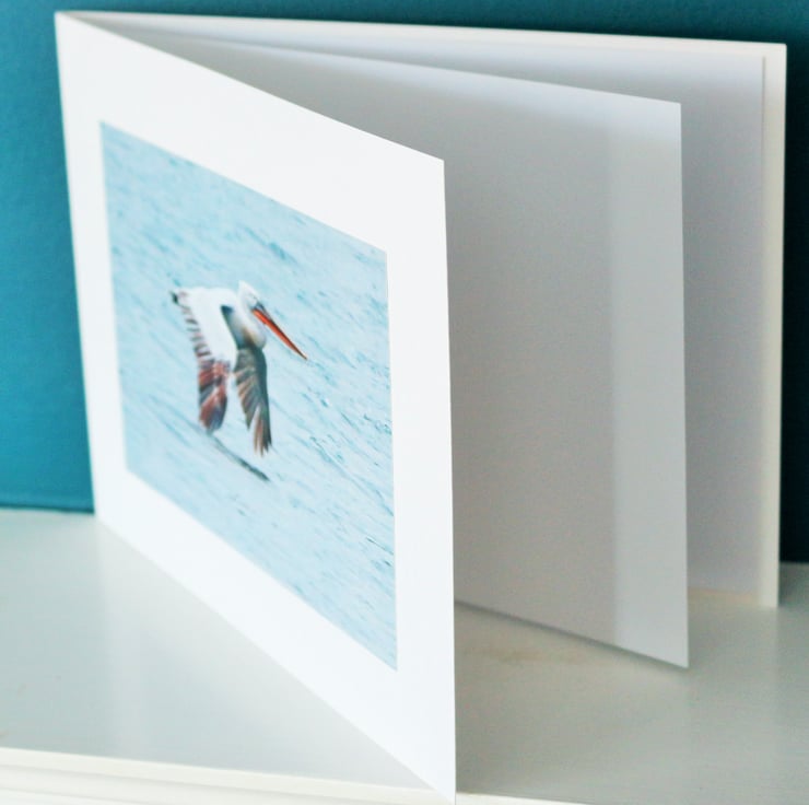 6" x 4" photo of a Dalmatian Pelican, mounted on a white textured card, with a plain paper blank inner, for your own personal message. A white envelope is included. The photo was taken back in 2016, when this huge bird visited Cornwall, coming all the way from northern Russia.