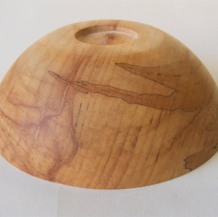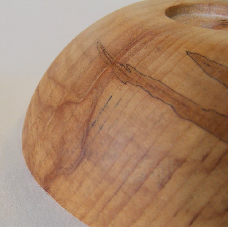 Small Spalted horse chestnut bowl, 105 x 37mm (10.5 x 3.7cm) A small Spalted Horse chestnut bowl, with a narrow base curving round to an in sloped rim. It has streaks and patches of pink hued brown with some areas bounded by thin dark lines. It could be used for decoration, small objects or as a food, ingredient or nibbles bowl