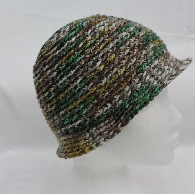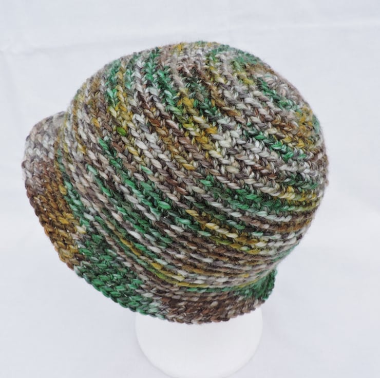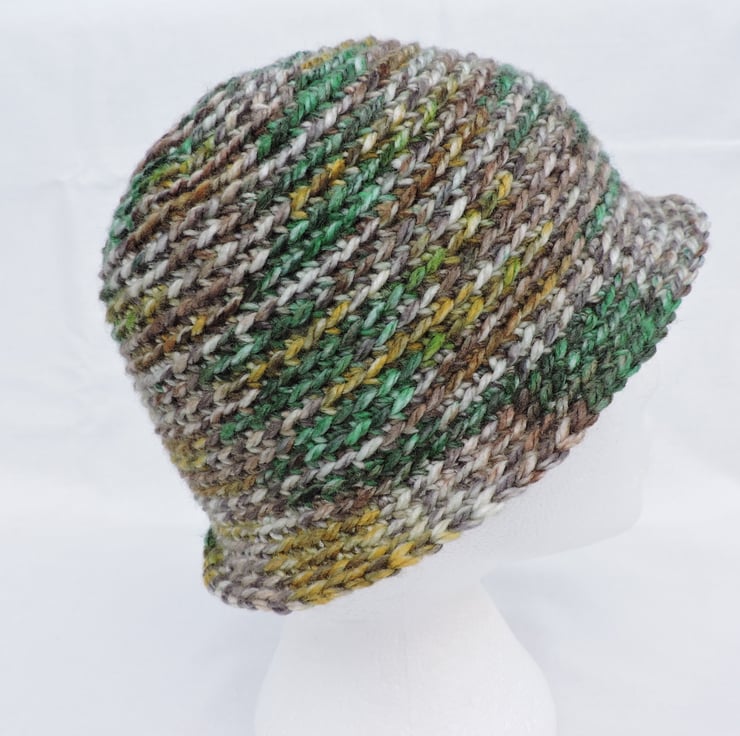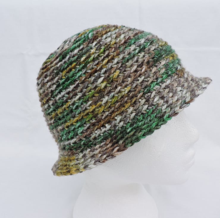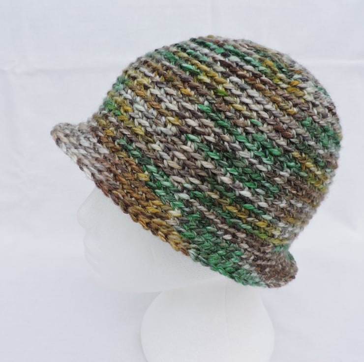 This adults cloche hat has been crocheted in a soft chunky acrylic yarn with the colours running randomly throughout the hat. Lovely autumn colours of green, mustard, brown and cream. Ideal for keeping you warm but stylish in the cold weather.