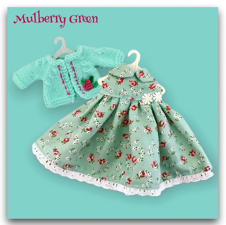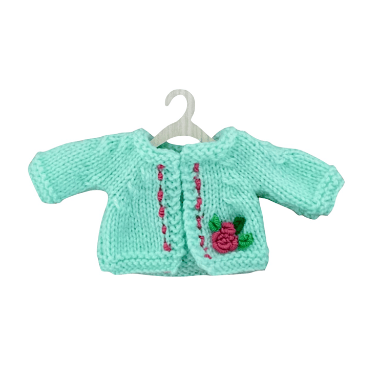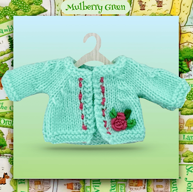 A really pretty turquoise cardigan, embroidered with a pink rose, to fit the Mulberry Green characters. The cardigan is hand knitted and matches the turquoise rose dress.