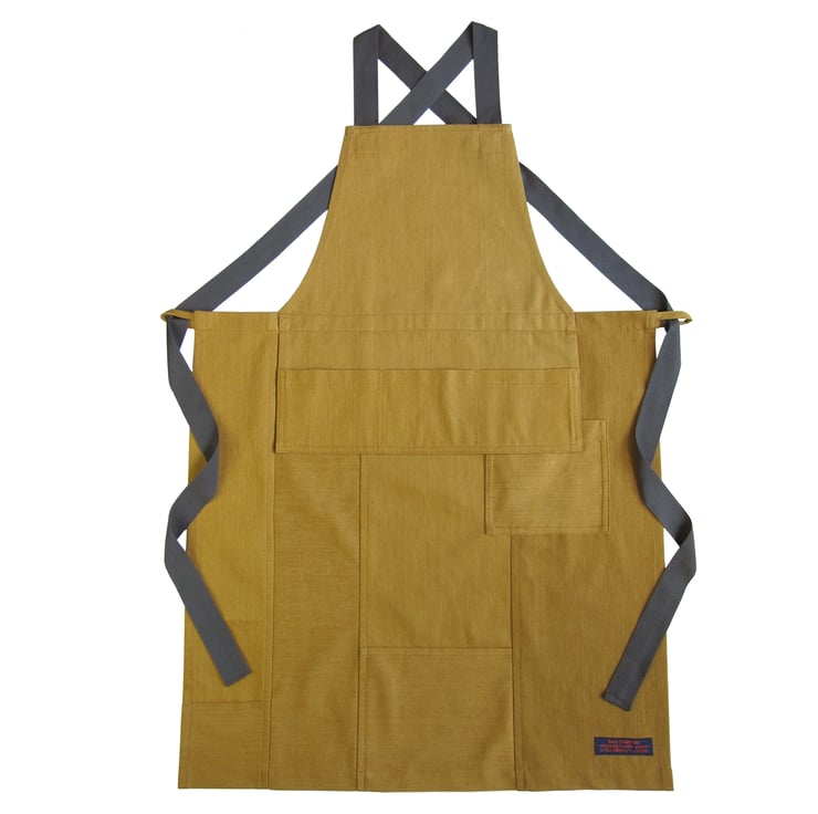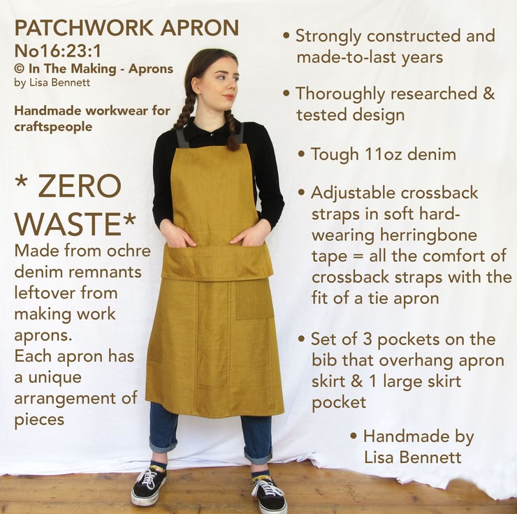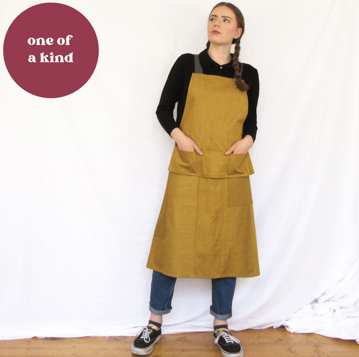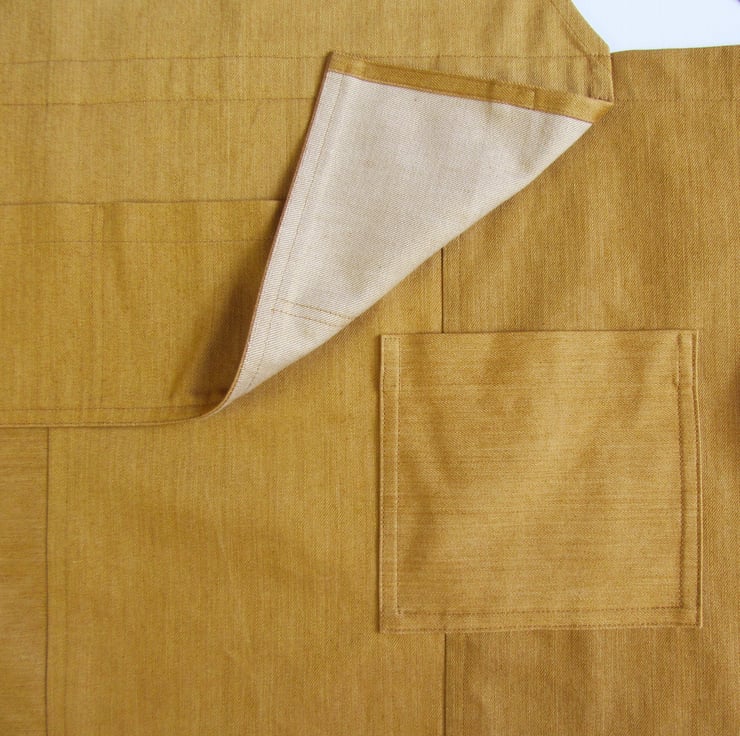 The ochre denim fabric used for this apron is absolutely gorgeous, golden on the outside and creamy colour on the reverse! The remnants that go to make up the apron came from making crossback aprons and split leg aprons - there are still a couple of No7:1 adjustable crossback aprons left in this fabric.