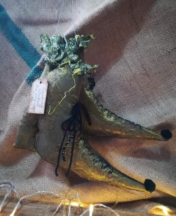 Pair of witches shoes made from my own design in 1950s brocade fabric,