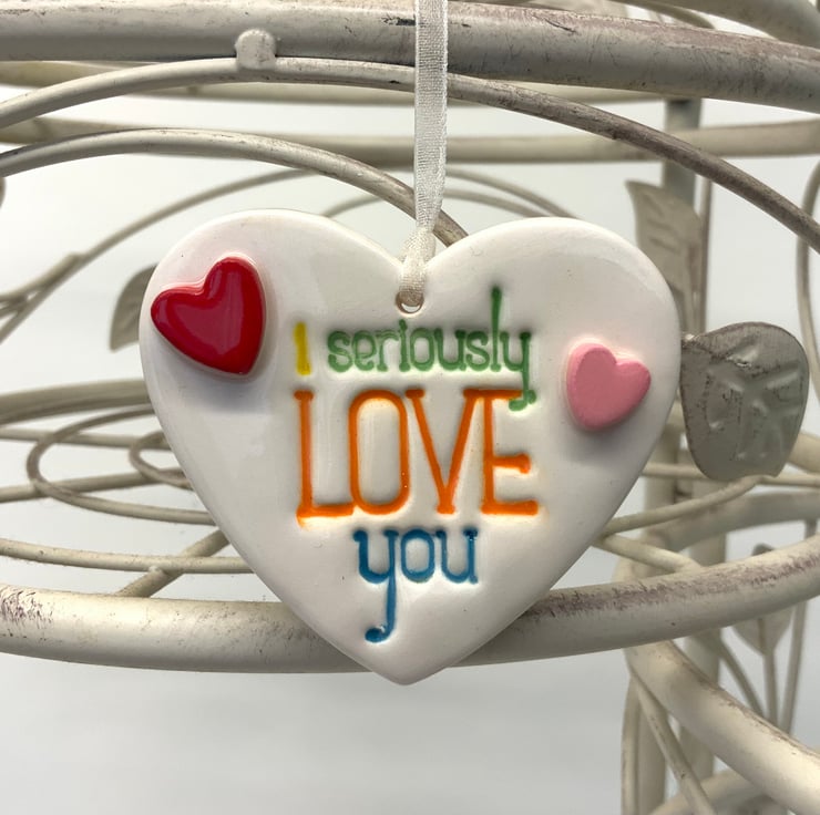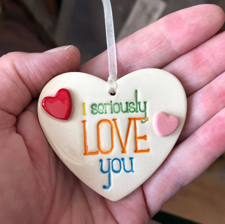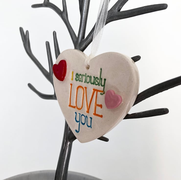 This little heart is made from white earthenware clay and imprinted with the words I Seriously Love You. It has been fired twice, once to the bisque stage and then a second firing for the clear glaze. It measures 6.5 centimetres wide x 5.5cm height x 5mm thick.
