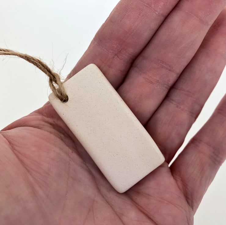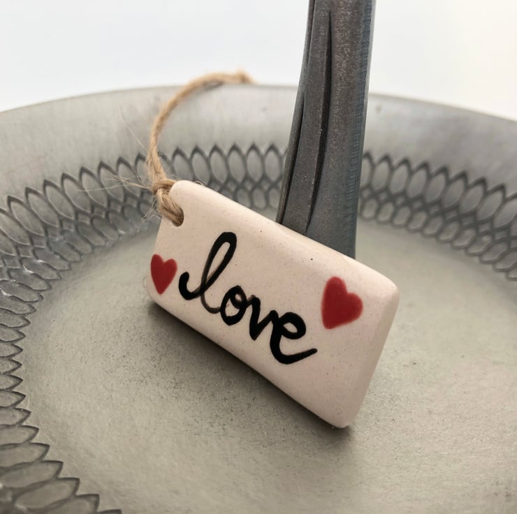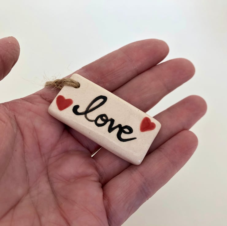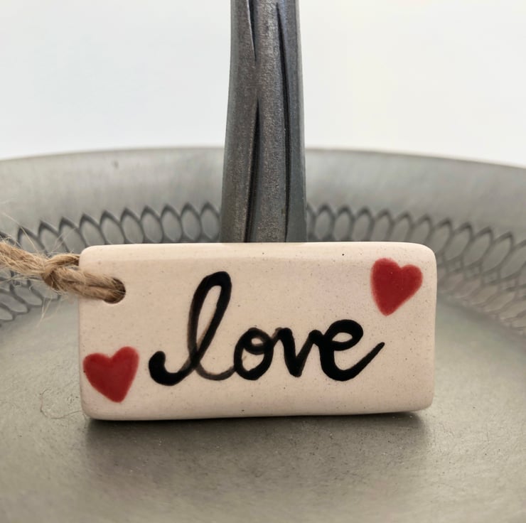 This little tag is made from white earthenware clay and hand painted with the word Love and two little hearts.. It has been fired twice, once to the bisque stage and then a second firing for the clear glaze. It measures 4.5 centimetres wide x 2.5cm height x 7mm thick.
