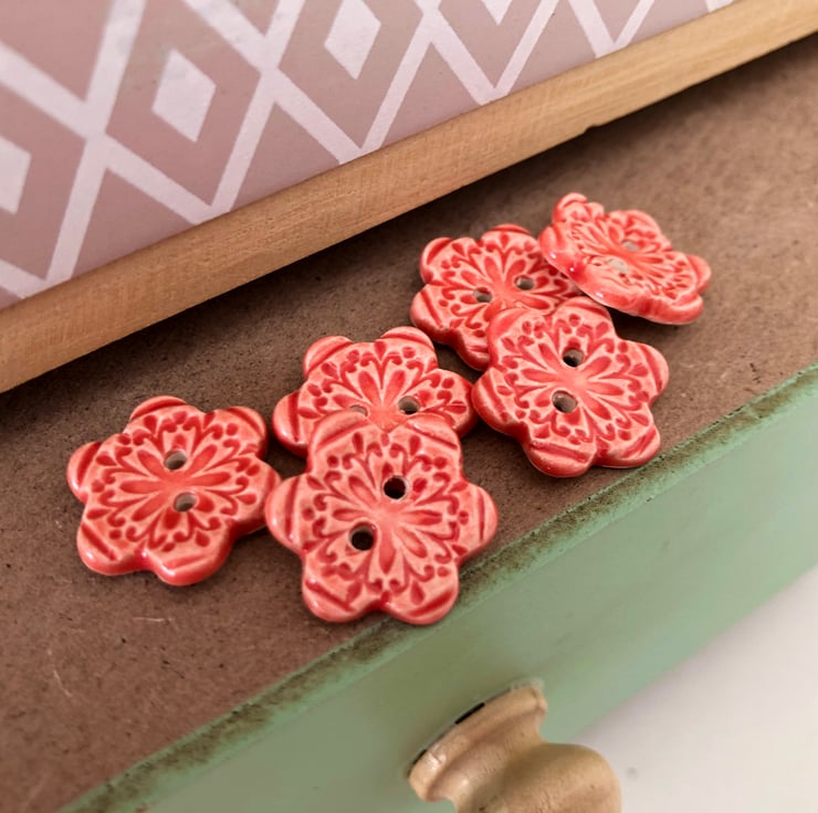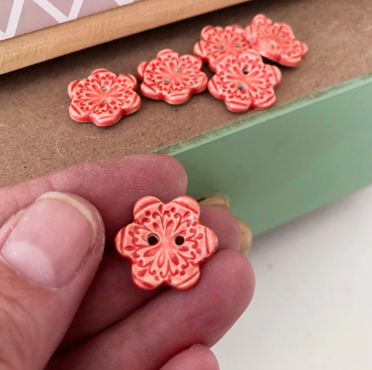 This cute little set of buttons are made from white earthenware clay and twice fired to a top temperature of 1100 degrees, so they are nice and strong. They have been embossed with pattern and then each one has been finished in a rich, glossy glaze on the front of the button only. They measure 20mm diameter. They can be machine washed at 30-40 degrees or handwashed with no problems. Perfect for all sorts of arts and crafts projects.