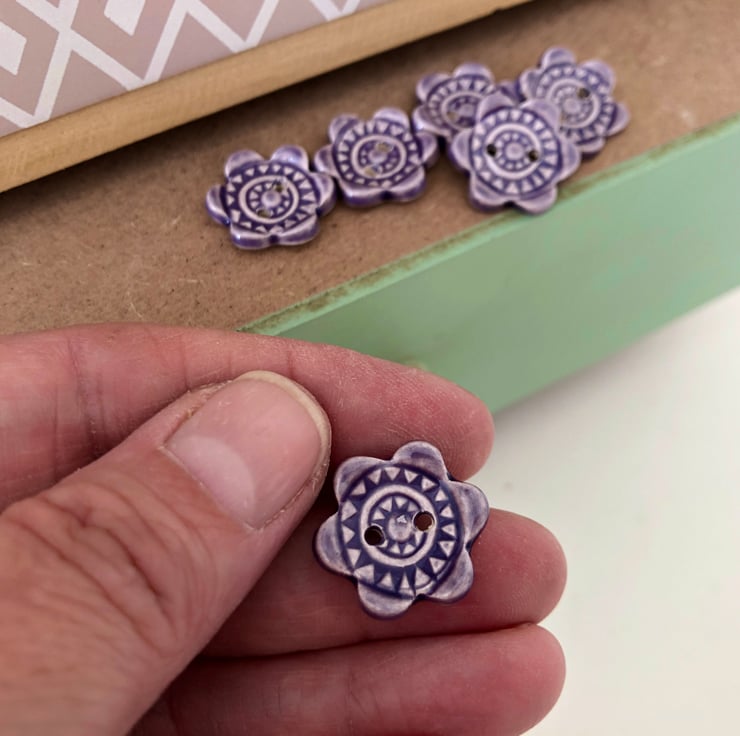 This cute little set of buttons are made from white earthenware clay and twice fired to a top temperature of 1100 degrees, so they are nice and strong. They have been embossed with pattern and then each one has been finished in a rich, glossy glaze on the front of the button only. They measure 20mm diameter. They can be machine washed at 30-40 degrees or handwashed with no problems. Perfect for all sorts of arts and crafts projects.