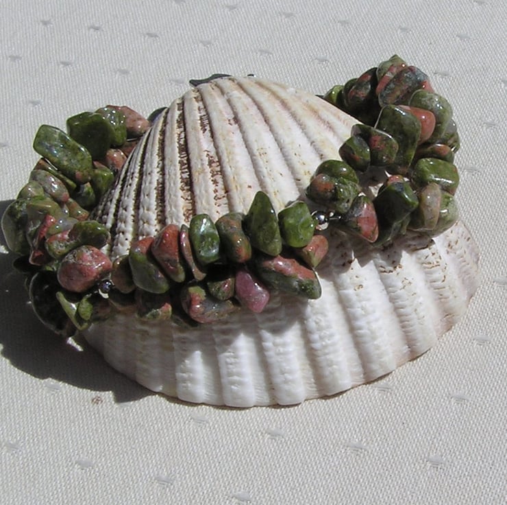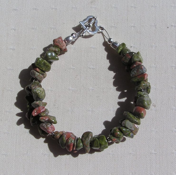 This Stunning Delicate Bracelet is made wholly from Unakite – Double stranded Gem chips separated into short sections by Silver spacer beads with a tiny Silver Heart at each end - An amazing Earthy Glistening combination