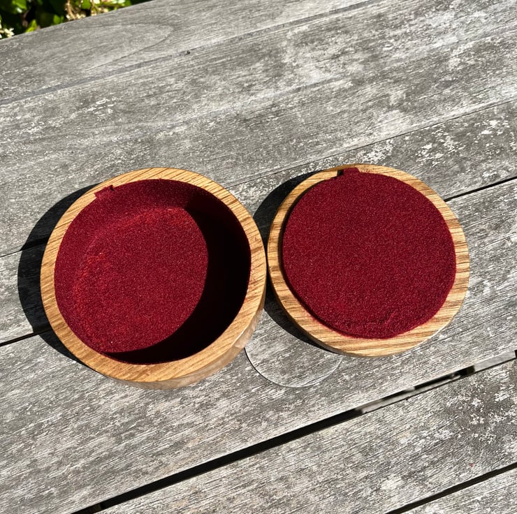 A beautiful solid oak wood jewellery / trinket box finished in a light satin sheen inlaid with a lotus flower pattern. The box internals finished in soft cardinal red flocking.