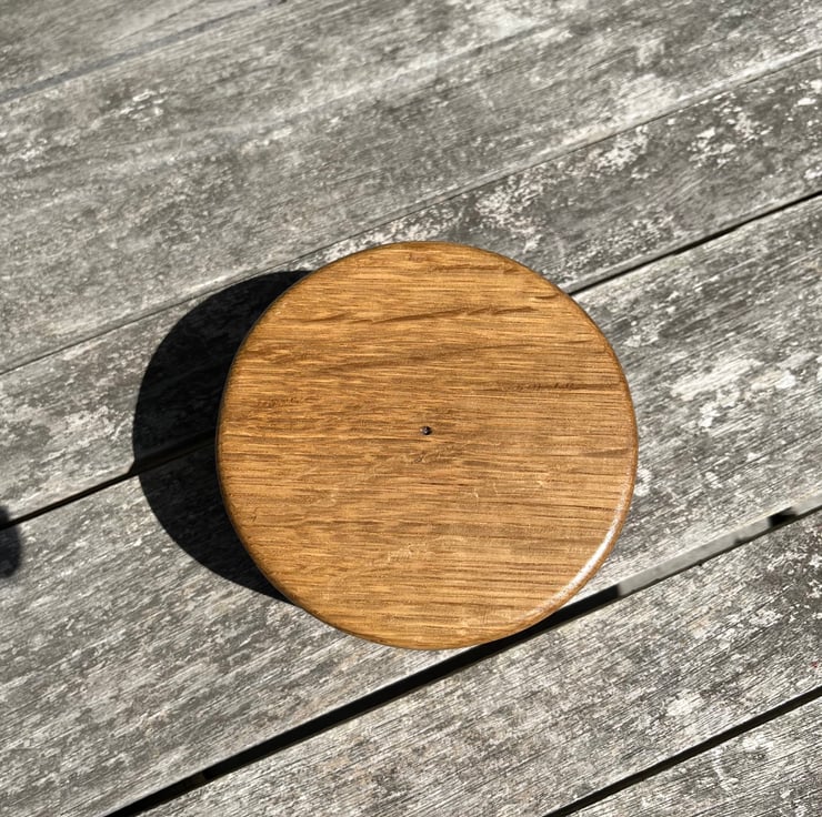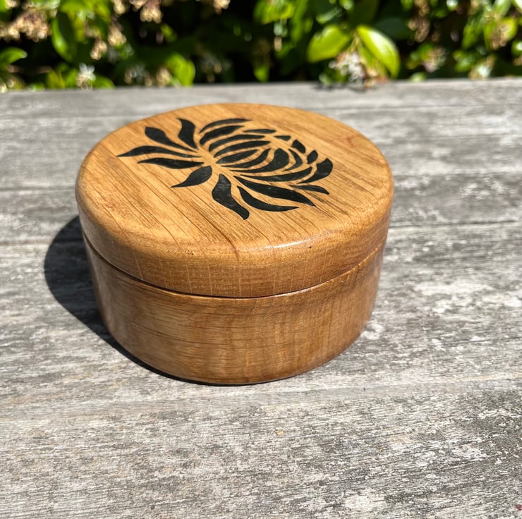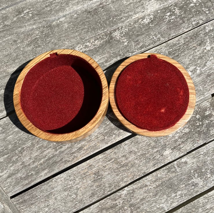 A beautiful circular shaped jewellery / trinket box made from solid oak. The top is decorated with a stylised dahlia flower pattern inlaid into the lid. The pattern, rather than being painted, has been cut through the lid and then inlaid with black epoxy, which will not degrade with polishing and will maintain the boxes appearance for many years. Externaly the box is finished in a durable light satin sheen, internally the surfaces are coated in a soft cardinal red flocking.