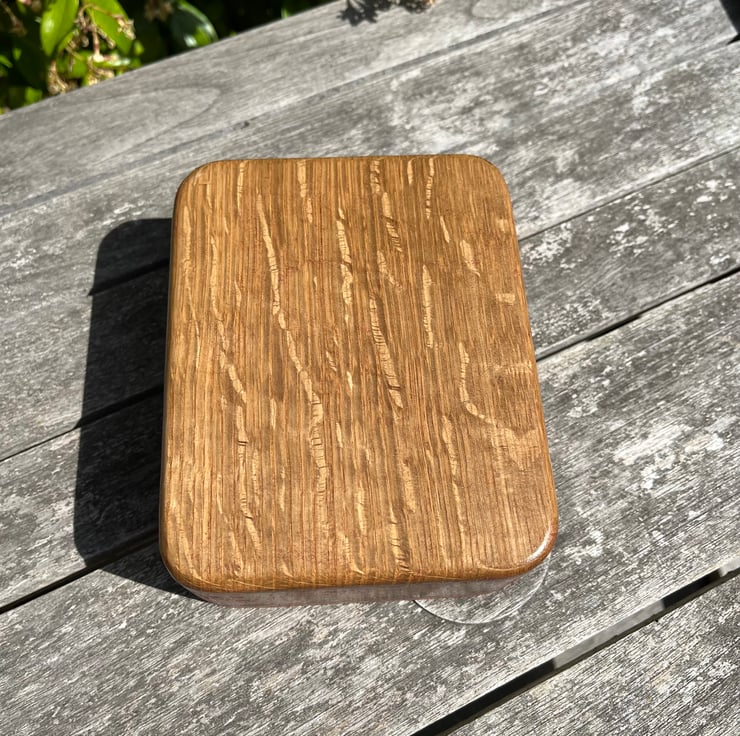Having made a number of shaped trinket boxes in oak and walnut, I wanted to enhance the surface decoration and experimented with inlaying the top with epoxy. The pattern was cut through the box lid, inlaid, sanded, sanded & sanded and then coated with a drying oil finish, which i hope you agree, provides a very attractive and durable finish.