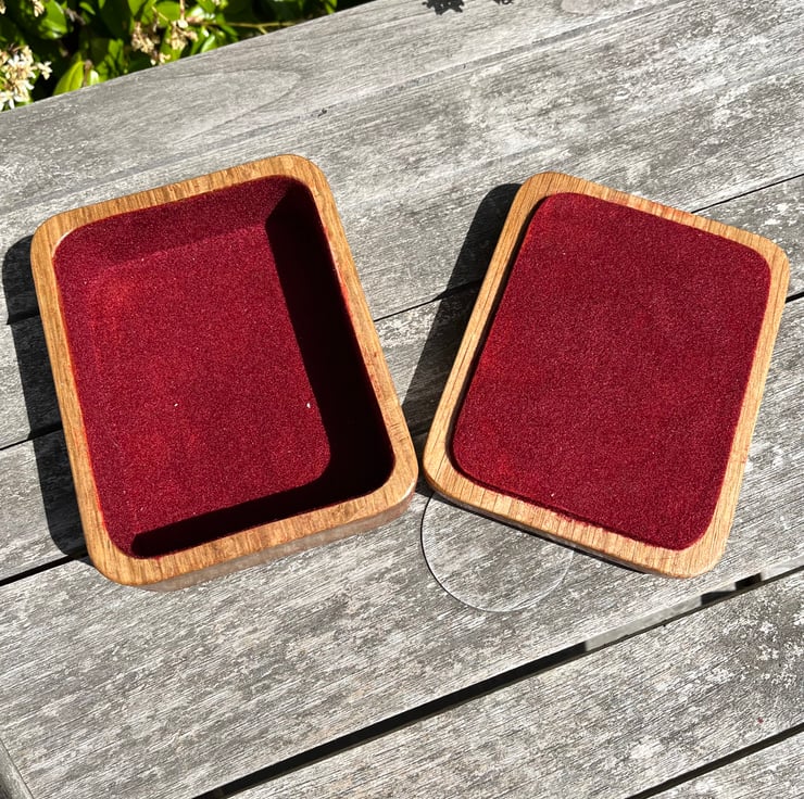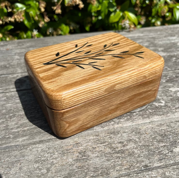 A beautiful oblong shaped jewellery / trinket box made from solid oak. The top is decorated with an inlaid stylised grass stems pattern. The pattern, rather than being painted, has been cut through the lid and then inlaid with black epoxy, which will not degrade with polishing and will maintain the boxes appearance for many years. Externaly the box is finished in a durable light satin sheen, internally the surfaces are coated in a soft cardinal red flocking.