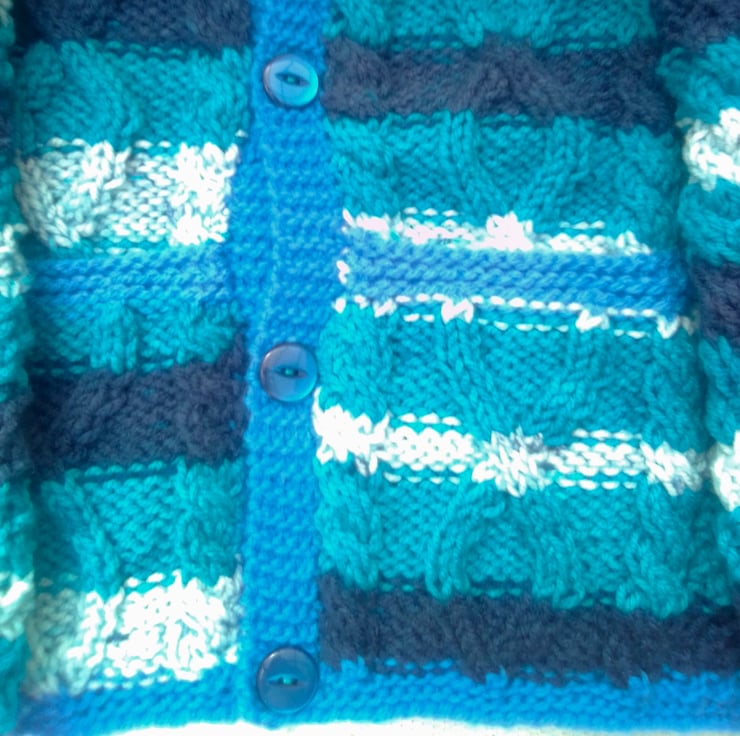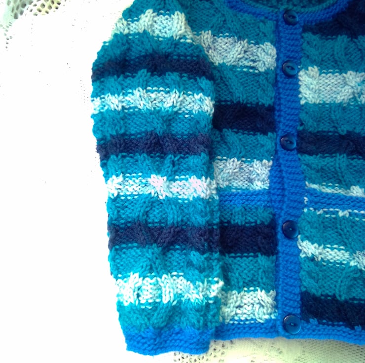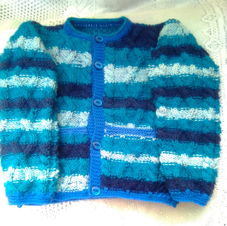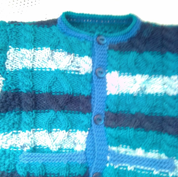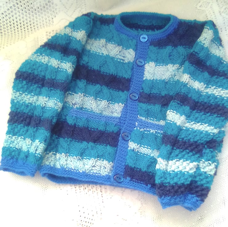 This unisex cabled cardigan with a pockets and an attractive cable pattern on the front and back is hand knitted in acrylic aran yarn. It is an ideal cardigan to keep your child warm on winter days.