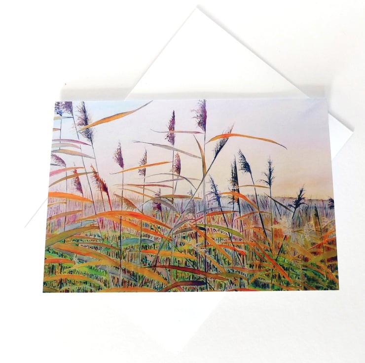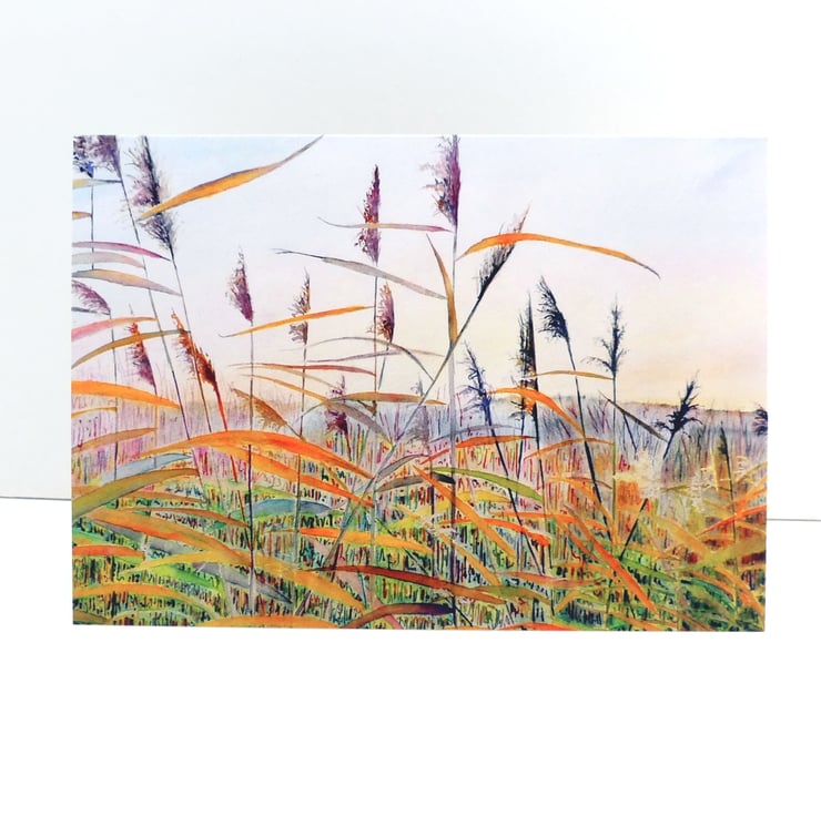 Rectangle A6 fine art greeting card produced from an image taken from my own original watercolour painting of reeds in the Fens.