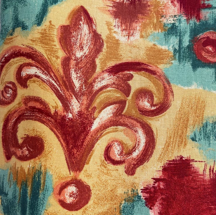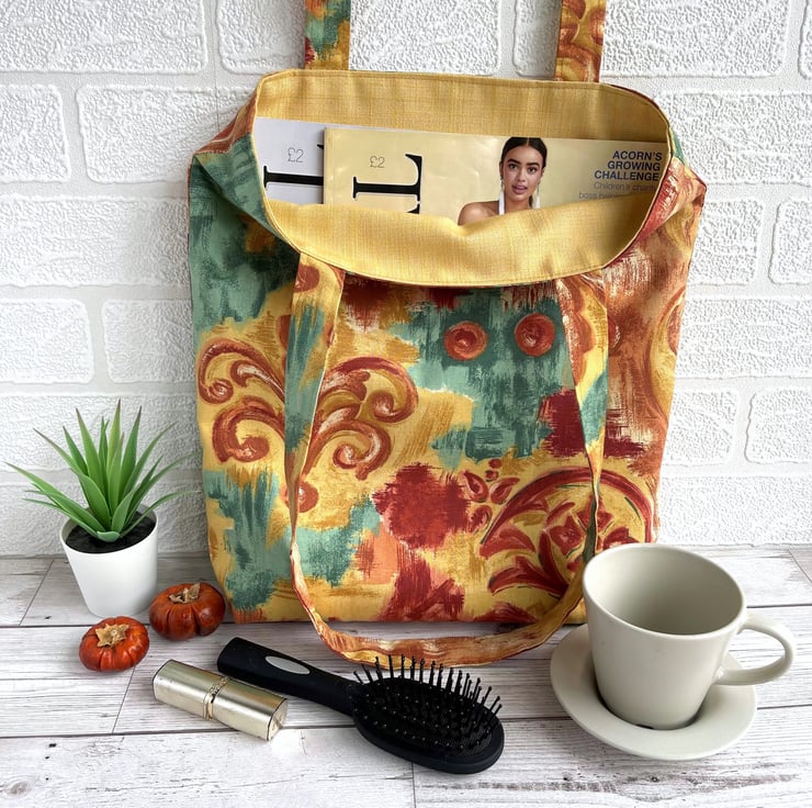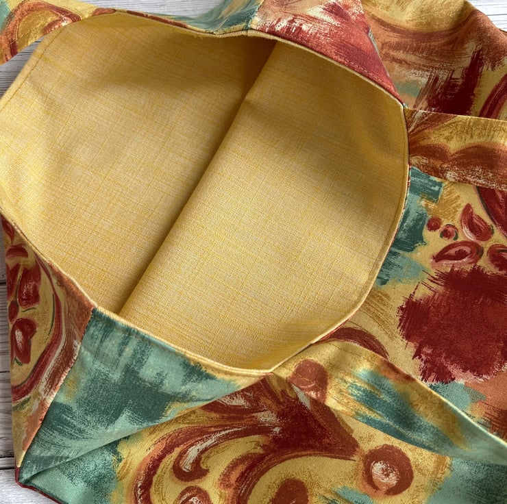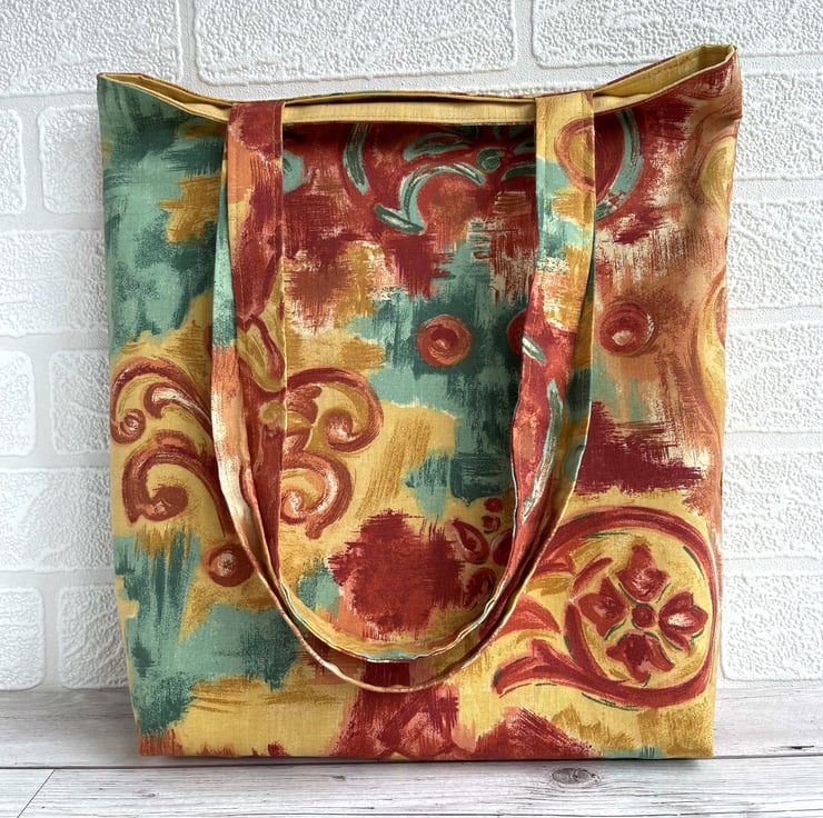 Spicy abstract tote bag. This lovely tote bag is made from print fabric with an abstract pattern in spicy shades of terracotta, golden yellow, green and dark red. The pattern features abstract motifs, shapes, and patches of colour that have the appearance of having been painted on to the fabric. The tote bag is lined with gorgeous linen-look fabric in a matching shade of golden yellow.