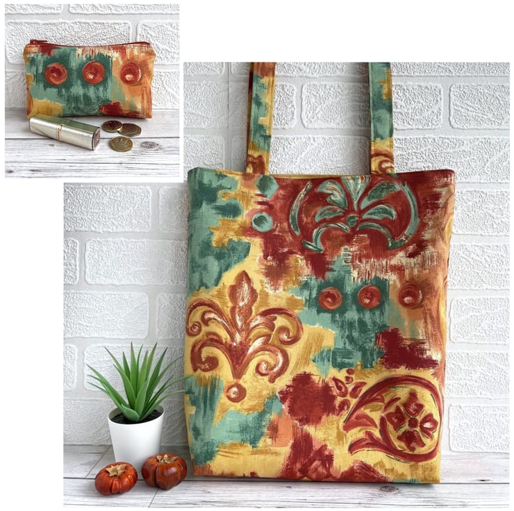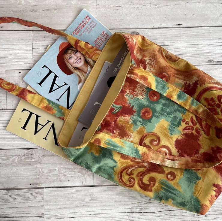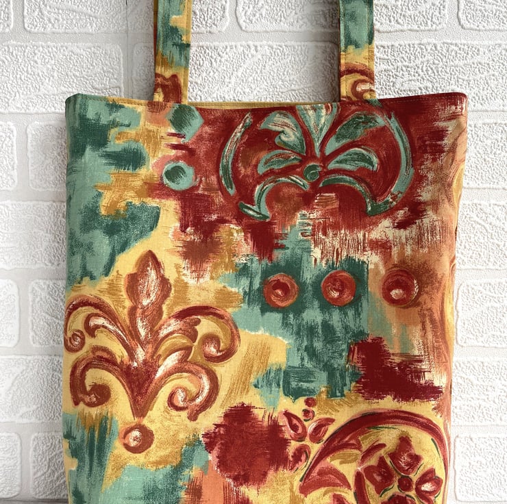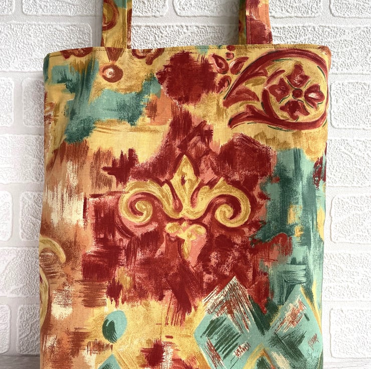 This tote bag is very versatile - perfect for use as a shopping bag, handbag or occasional bag. It can be easily folded and placed inside a handbag. With its striking abstract pattern and gorgeous spicy colours, it would make a lovely gift.