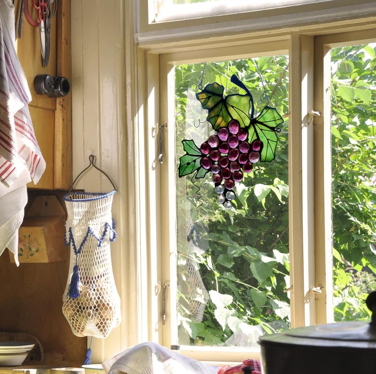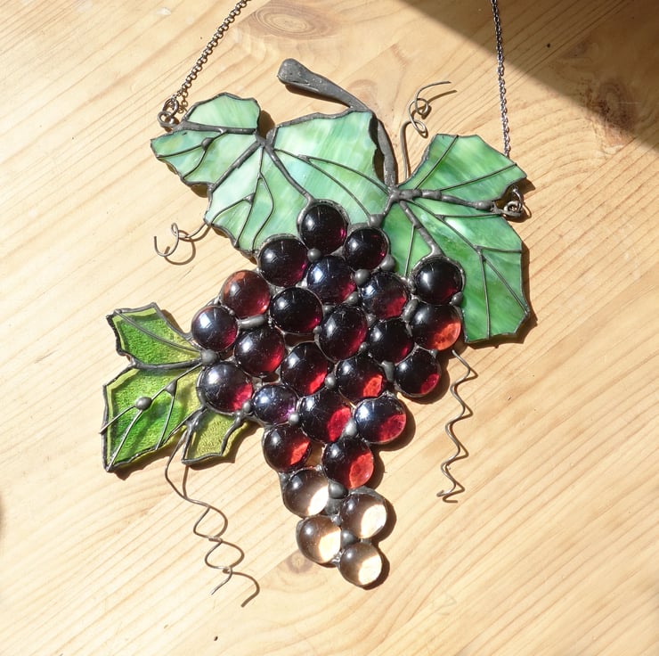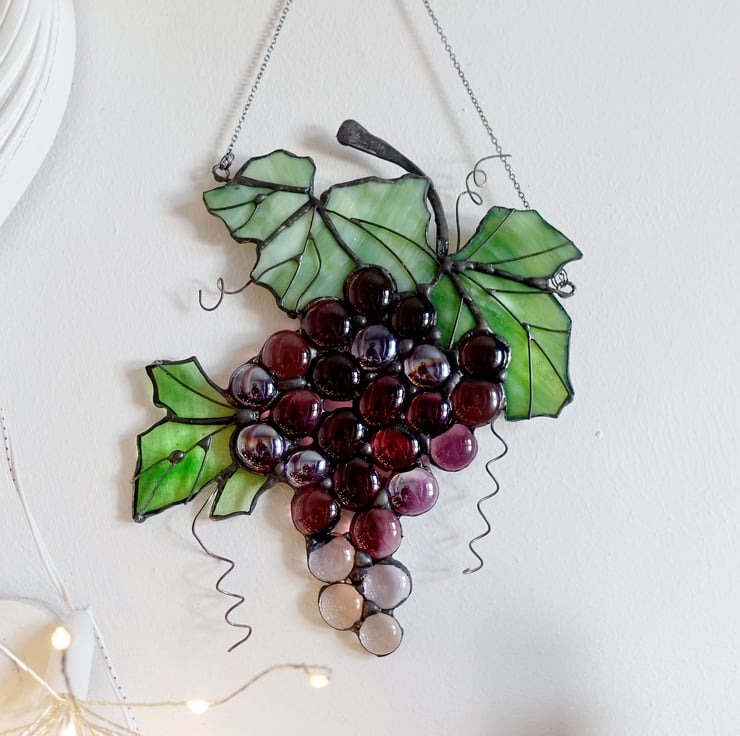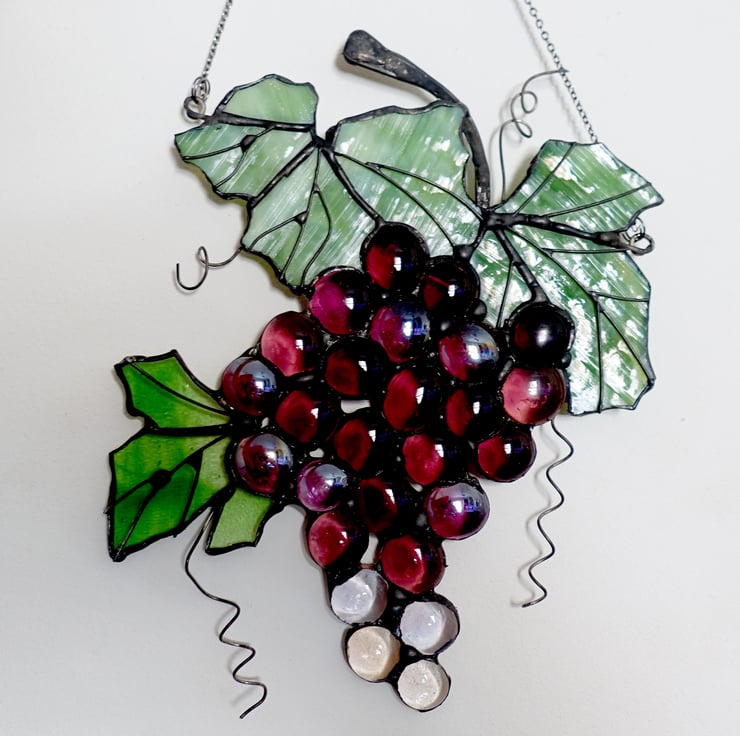 Hanging suncatcher grapes made from purple red glass jewels and green mottled and clear green glass for the leaves.