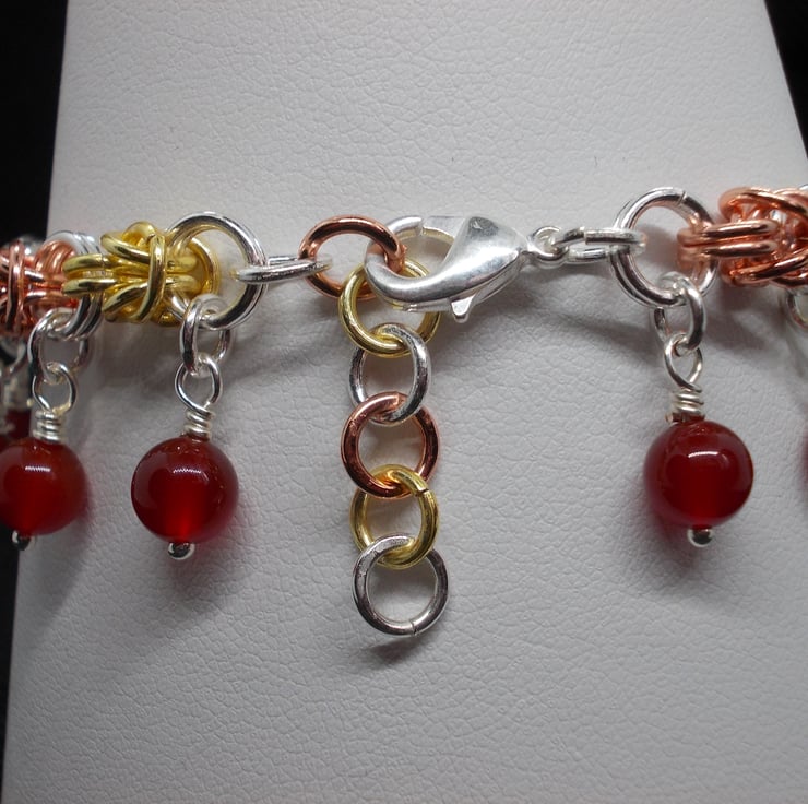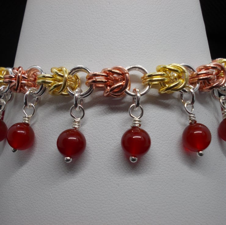 This bracelet feature the half byzantine knot as the base of a charm bracelet using 3 metal tones.