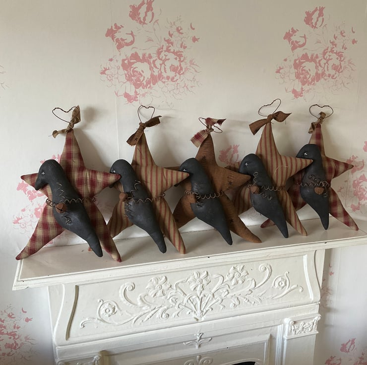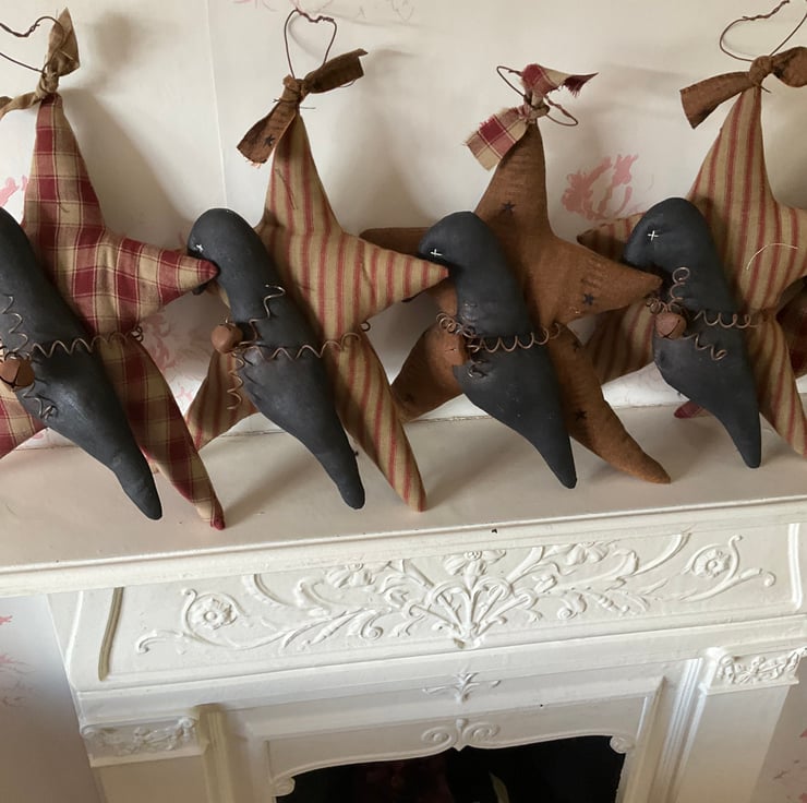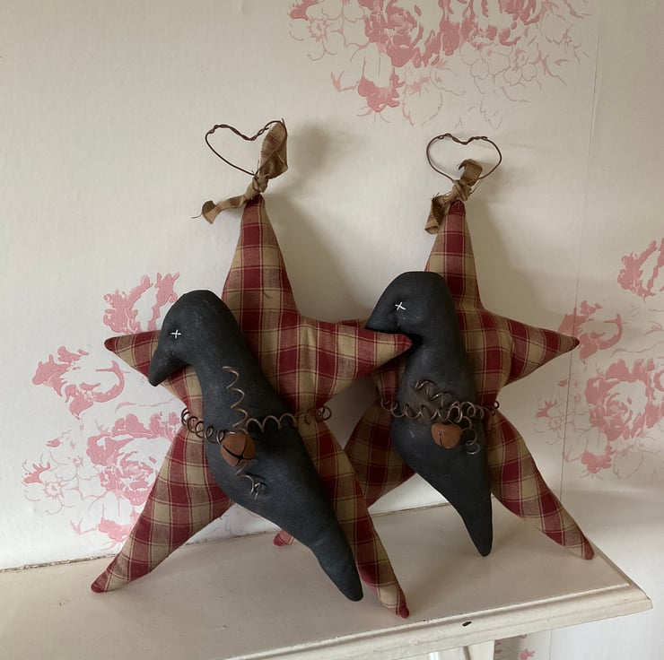 The star will sit on a shelf or can be hung from the decorative wired heart, finished off with a knotted strip of primitive fabric.