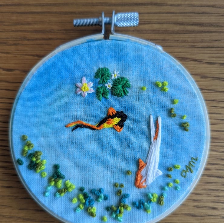 3" diameter natural linen hand-painted and embroidered with pond weed, two koi and lillies from above.