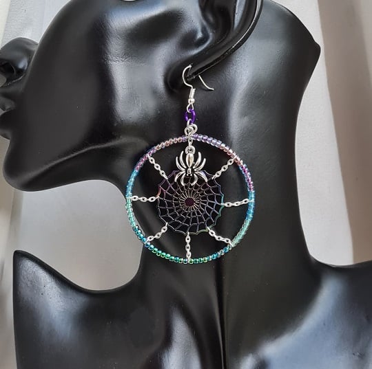 Earring length is approx 8.5cm long from the top of the ear wire to the bottom of the beaded ring. Ear wires are Silver tone Stainless Steel (if you require alternative ear wires please go to the Choose Options box). Spider web is Stainless Steel in a beautiful shimmery colour called Rainbow Iris. Chains are Silver Plated metal, beads are glass Toho seed beads in various colours on round memory wire (6cm wide). Spider charm is Tibetan Silver.