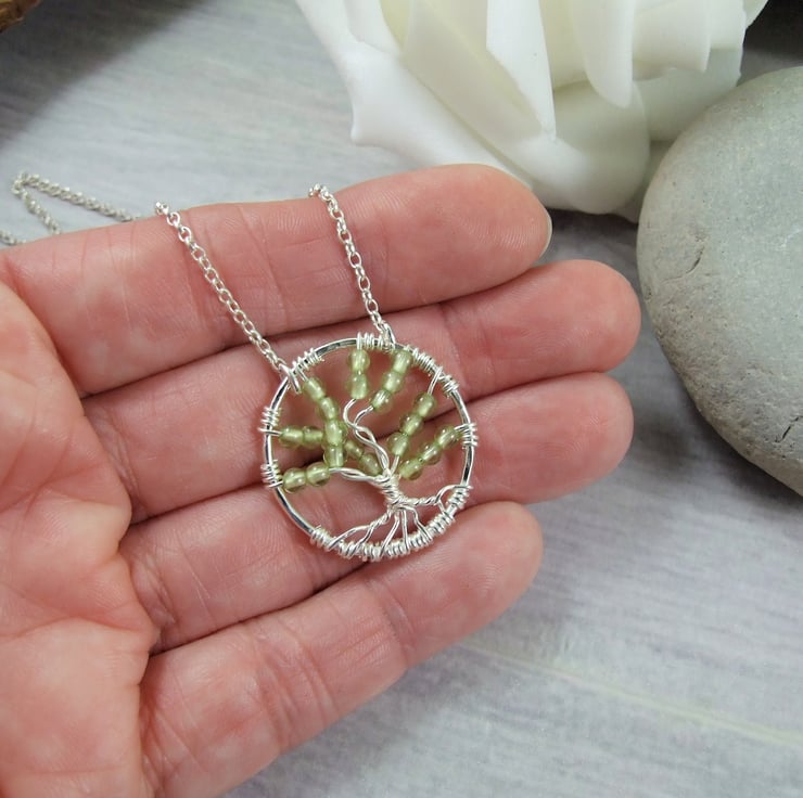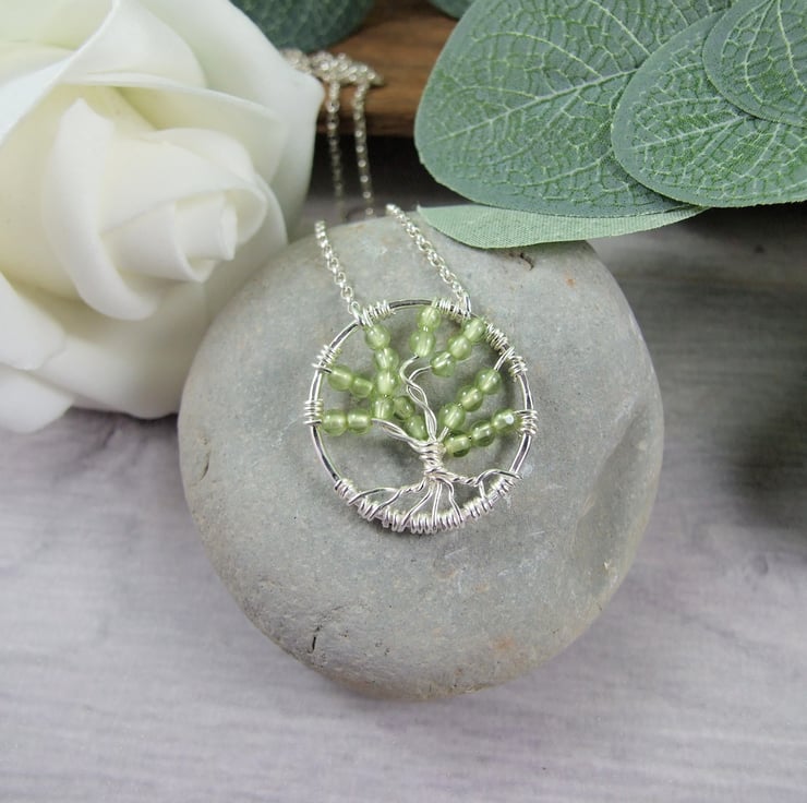 I have created the tree of life using sterling silver wire, first making the outer circle, shaping and soldering then making the tree from finer silver wire. The wire is wrapped around the base and soldered along the bottom and then the trunk and branches have been formed by hand twisting the wire. I then added tiny 2-3mm peridot gemstones to the branches and secured in place by wrapping the wire around the frame. Finished with an 18 inch sterling silver chain.