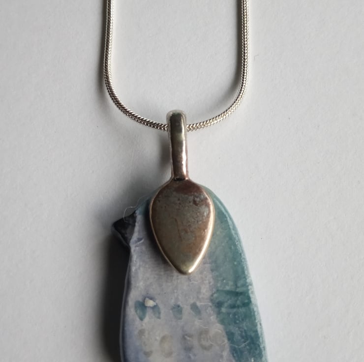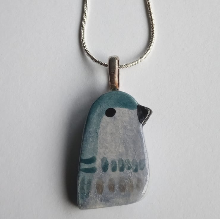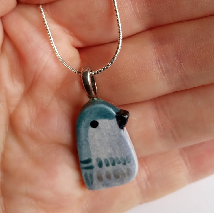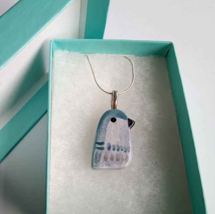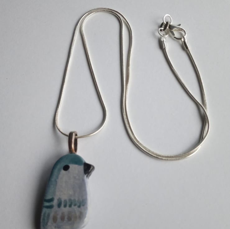 This is a very cute bird, glazed with various shades of blue and hung from a 18" silver plated snake chain.