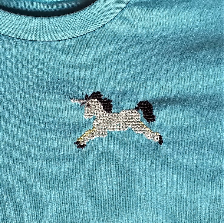 There has been a craze for unicorns for a while now. I designed some for an Afghan shawl, and my unicorn crazy granddaughter suggested I put one on T-shirts and bibs.