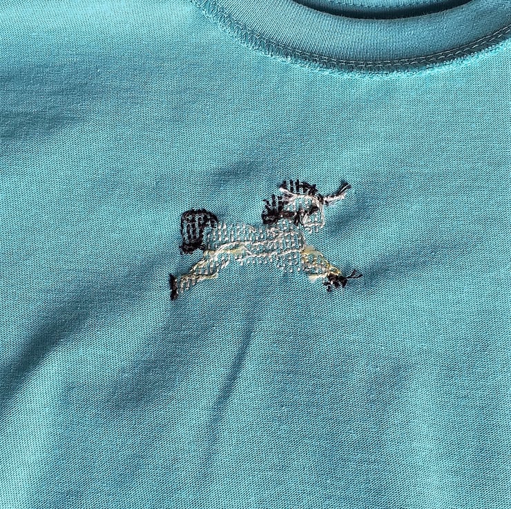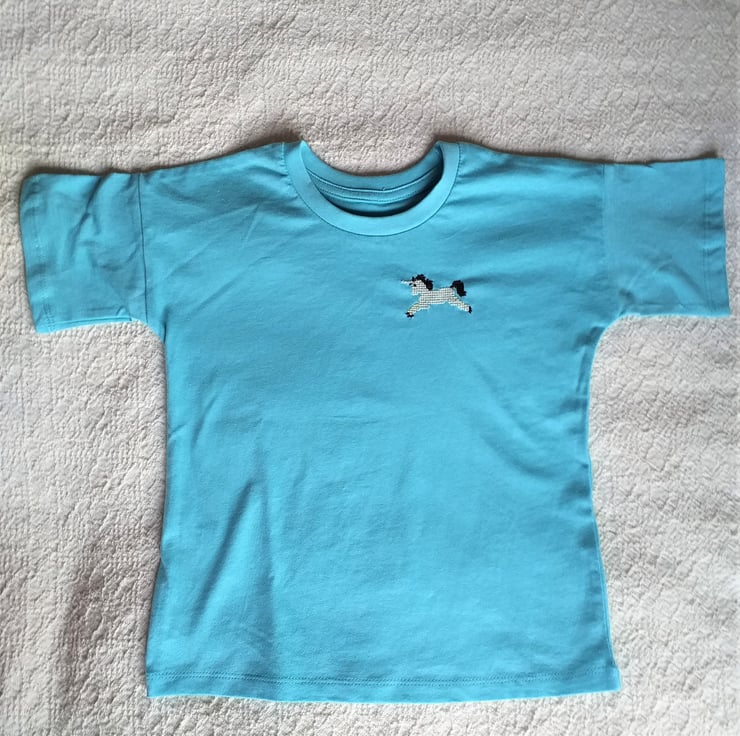 This is a very pretty light turquoise T-shirt with short sleeves. I have hand embroidered a white unicorn with a sparkly horn and dark brown mane, tail and hooves on the front. The shirt is 100% cotton and can be machine washed. As I never use a permanent backing material when hand stitching kids' clothing, there is nothing inside this shirt to irritate your child's skin.