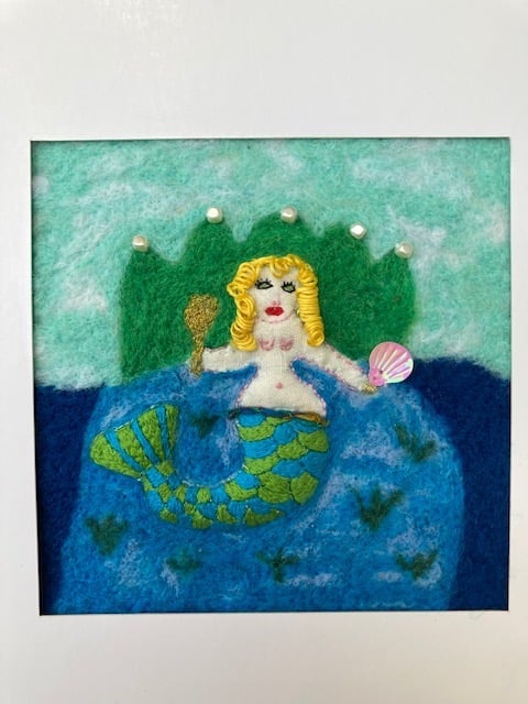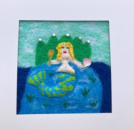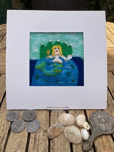 This picture depicts an alluring mermaid holding her golden mirror and scallop shell, ready to cast a spell on you. The mermaid's tail has been created using 'stump work' to give it a 3D effect & then hand embroidered with green & turquoise thread, interspersed with metallic threads. Her body is made from linen and her hair has been made with embroidery cotton, curled around a pencil to give it form. The background of sea and her thrown have been needle felted & there are small pearl sequins embellishing the thrown. She has a little belt around her stomach made from re-cycled sari silk. The picture measures 14cm x 14 cm & has been surrounded with picture mount to create a total picture size of 26cm x 26 cm. The back of the picture is lined with natural linen. You could hang the picture as is or frame it further in a frame of your own choice.