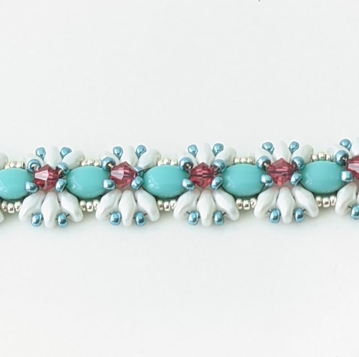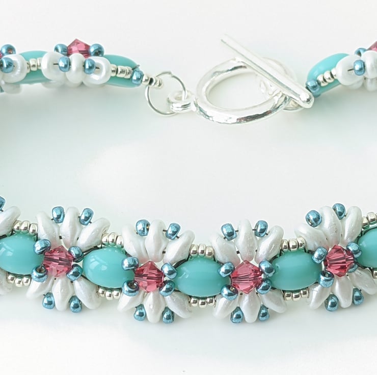 Beaded bracelet with turquoise blue glass beads with pink crystals also using silver miyuki japanese seed bads and turquoise also with a round toggle clasp length of19cm will come gift packaged