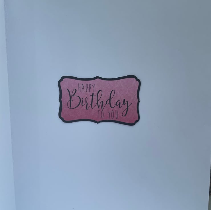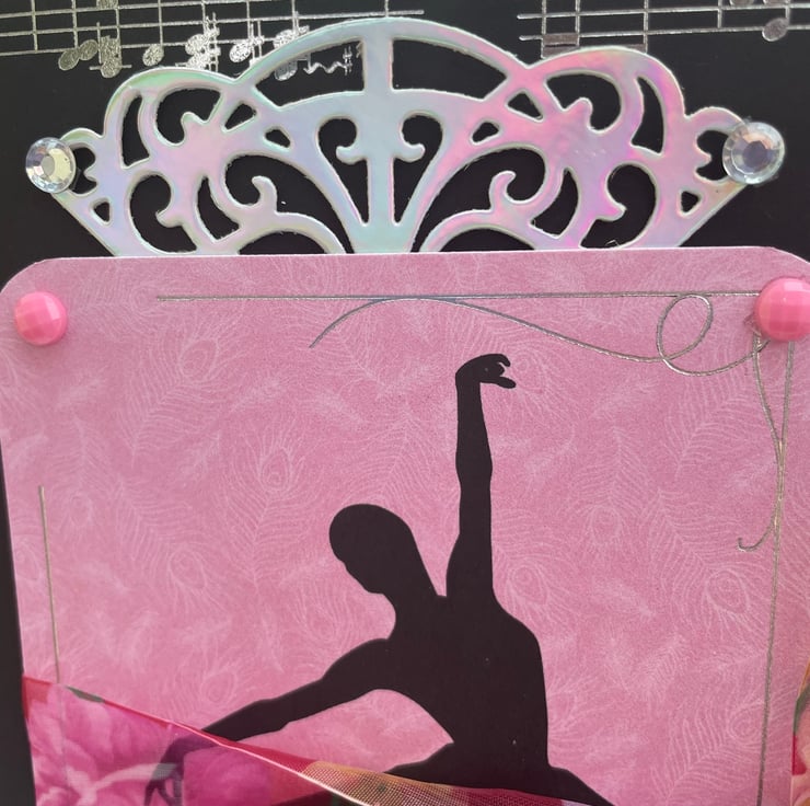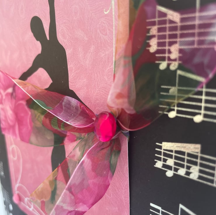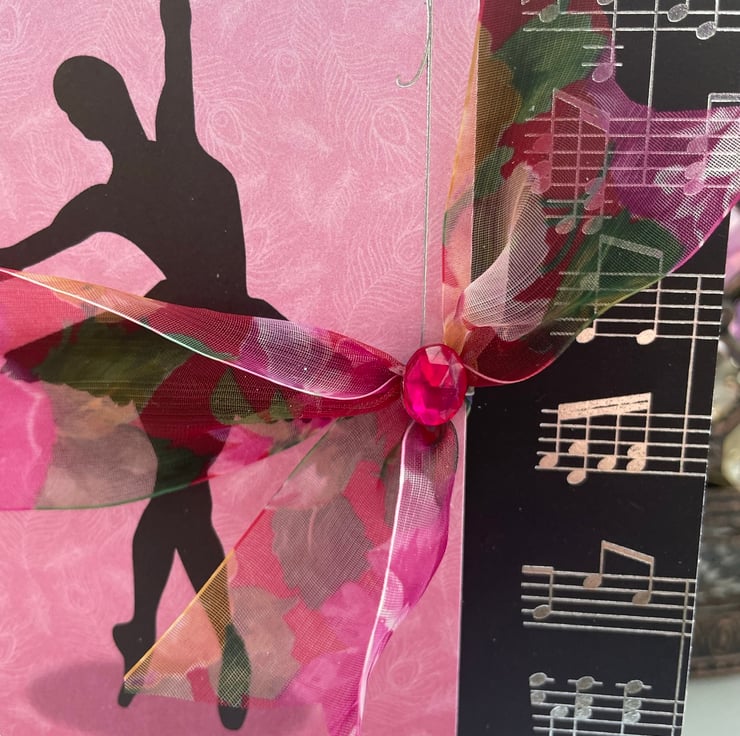 For every ballet dancing enthusiast. This beautiful A5 card features a silhouette of a ballet dancer in a full tutu and posing en pointe. This is on a delecate pink background with silver swirls as decoration. This is finished off with pink faux gems and a wrap around floral organza ribbon. This is mounted on a black and silver musical note paper. This is complimented with a silver swirl decoration at the top and bottom of the ballerina silhouette. Inside the card has a matching greeting that says Happy Birthday to you.