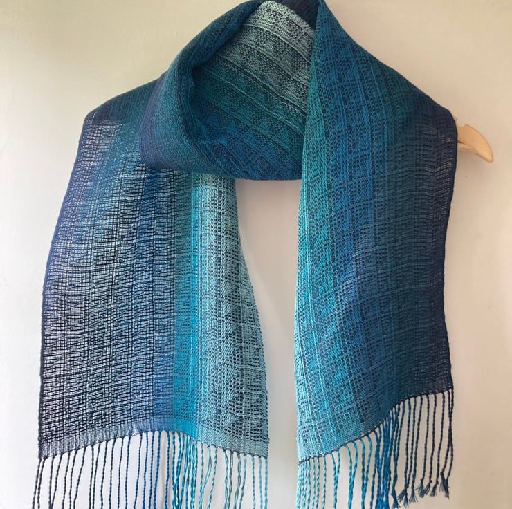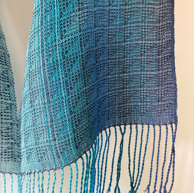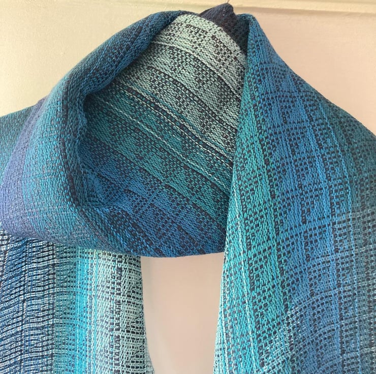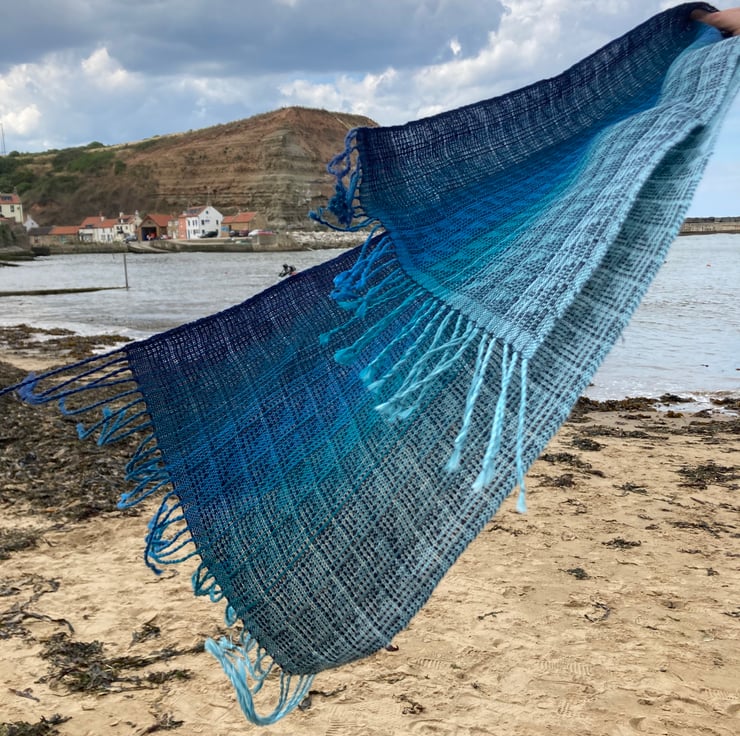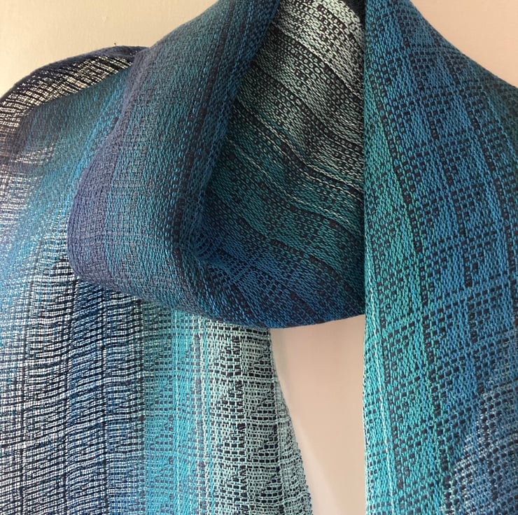 Handwoven in 6 shades of very fine cotton and linen in a Fibonacci gradient. Gently shifting from deep navy, turquoise and teal, to lighter shades of sea spray, the scarf is woven in a double-sided Scandinavian structure, producing triangular sails. The palette is inspired by the North Sea - the draft by the sails of the boats moored in Whitby marina.The perfect weight of scarf, and is great for people sensitive to wool and looking for a light summer scarf. Linen and cotton is non itchy and naturally regulates temperature. Very light, with a good drape.