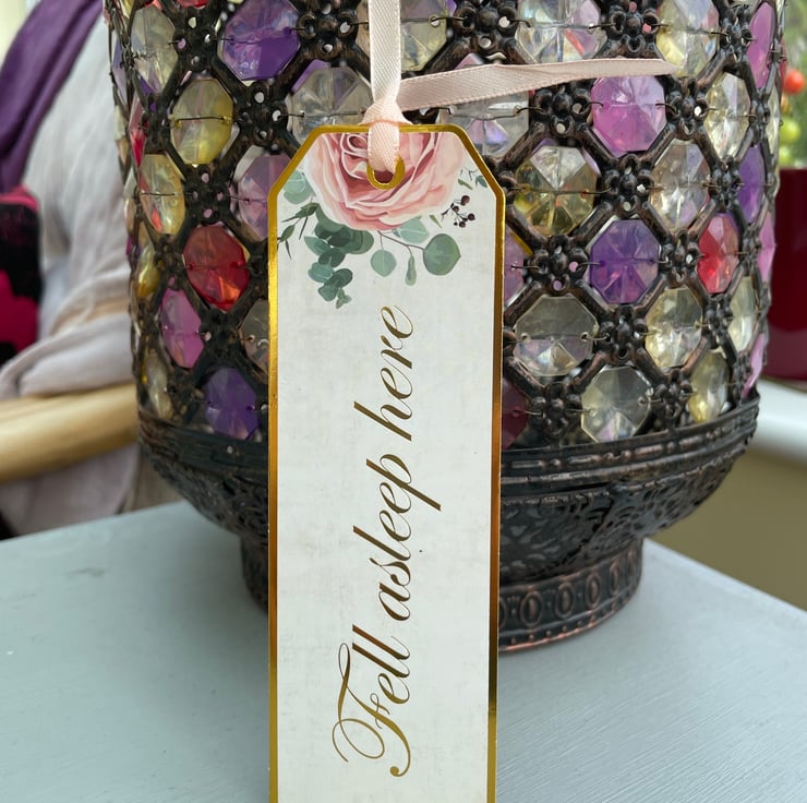 A pretty floral bookmark for an avid reader. This bookmark is 14x4.4cm in size and is made from lightweight card. It has a pretty floral design at the top and is finished with a peach satin ribbon. The inscription says Fell asleep here in a fancy font. A pretty addition to any book lovers collection.