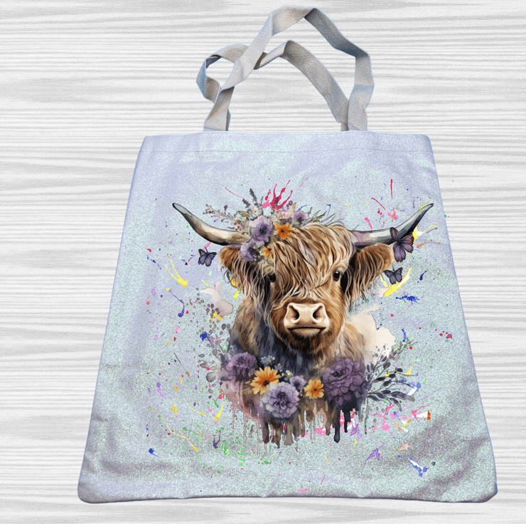 Beautiful glittery tote bag, with high quality sublimation print of a highland cow with flowers (One side only).
