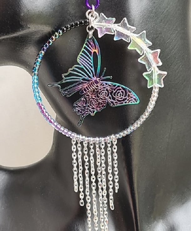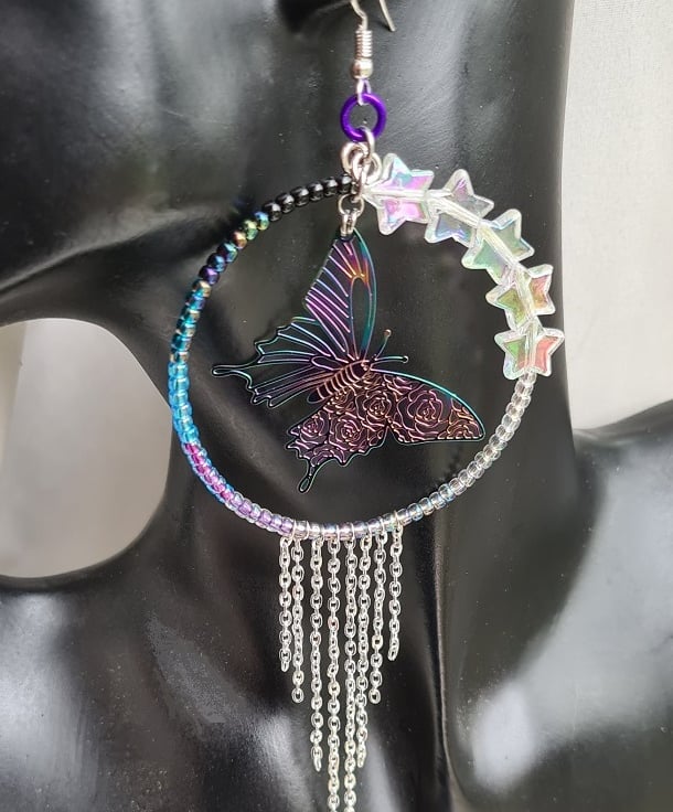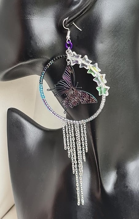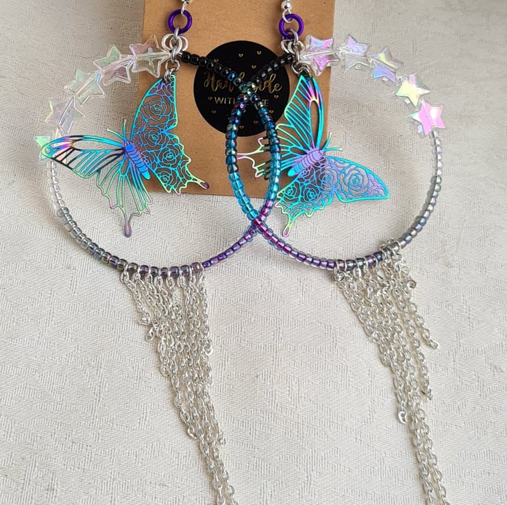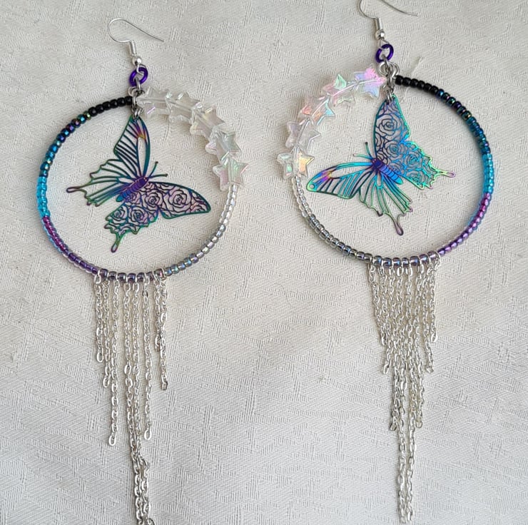 Earring length is approx 16cm from top of the ear wire to the bottom of the chains. Width is approx 6cm, Butterfly charms are 4cm H x 4.5cm wide as they hang. Ear wires are Sterling Silver, beads are Toho 8/0 glass in various colours, Stars are Acrylic with an AB finish. The dangly chains are Silver tone metal, the rings the beads are on are Silver plated memory wire.The Butterfly charms themselves are a colour called Rainbow Iris and have a shimmery multicoloured-tone and are stainless Steel.