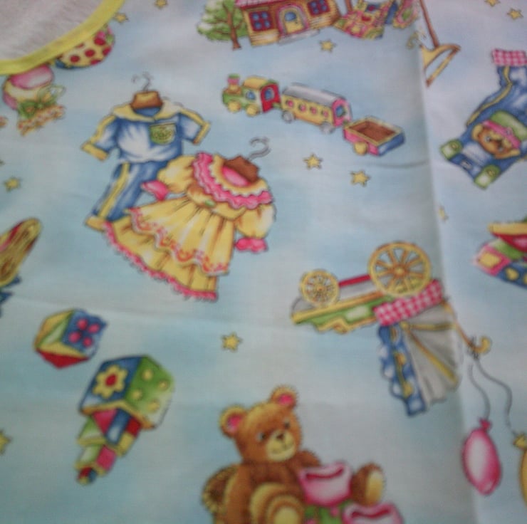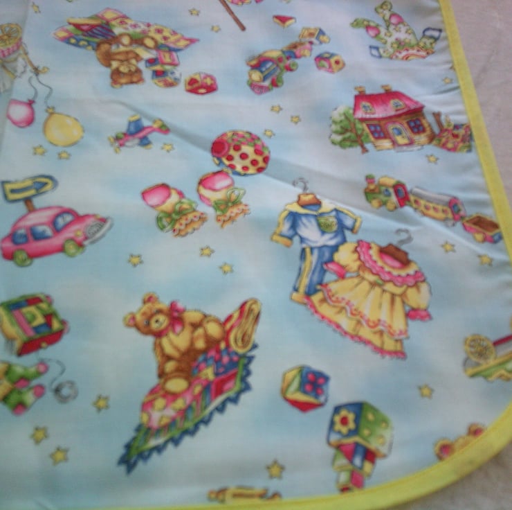 The design features toys including balls, dolls houses, trains, cars, teddy bears and dressing up clothes on a pale blue background and is edged with yellow bias binding.