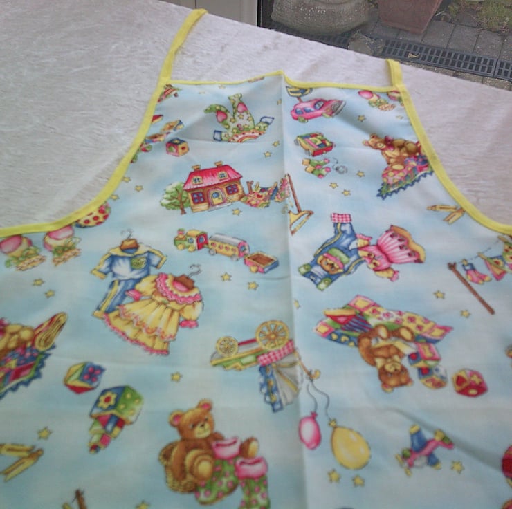 The straps are made using bias binding which is also used for edging the apron. If the neck strap is a bit too long it can be tied to shorten.