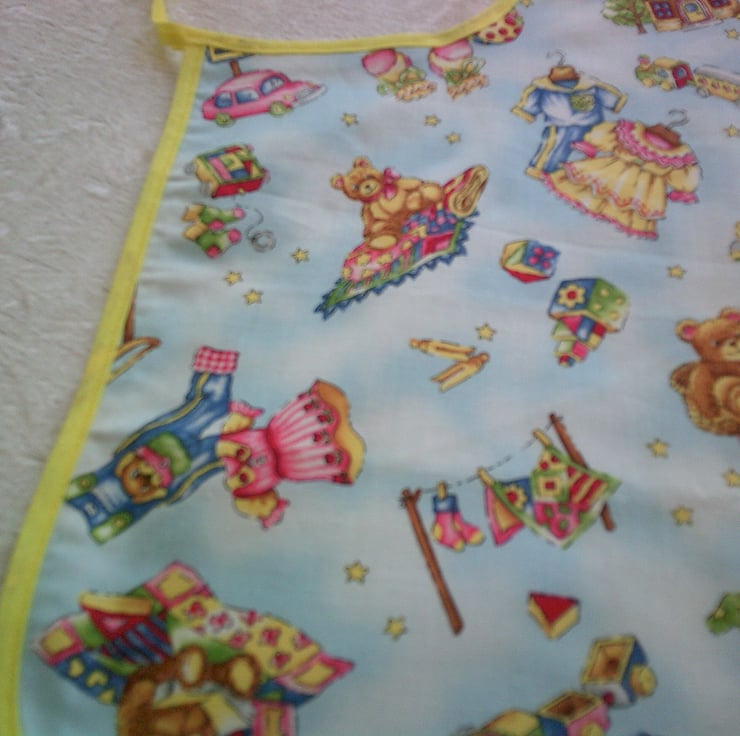It is fully machine washable on a 40 degree wash and is made from 100% Cotton. It is perfect for use when eating or even doing craft or painting.